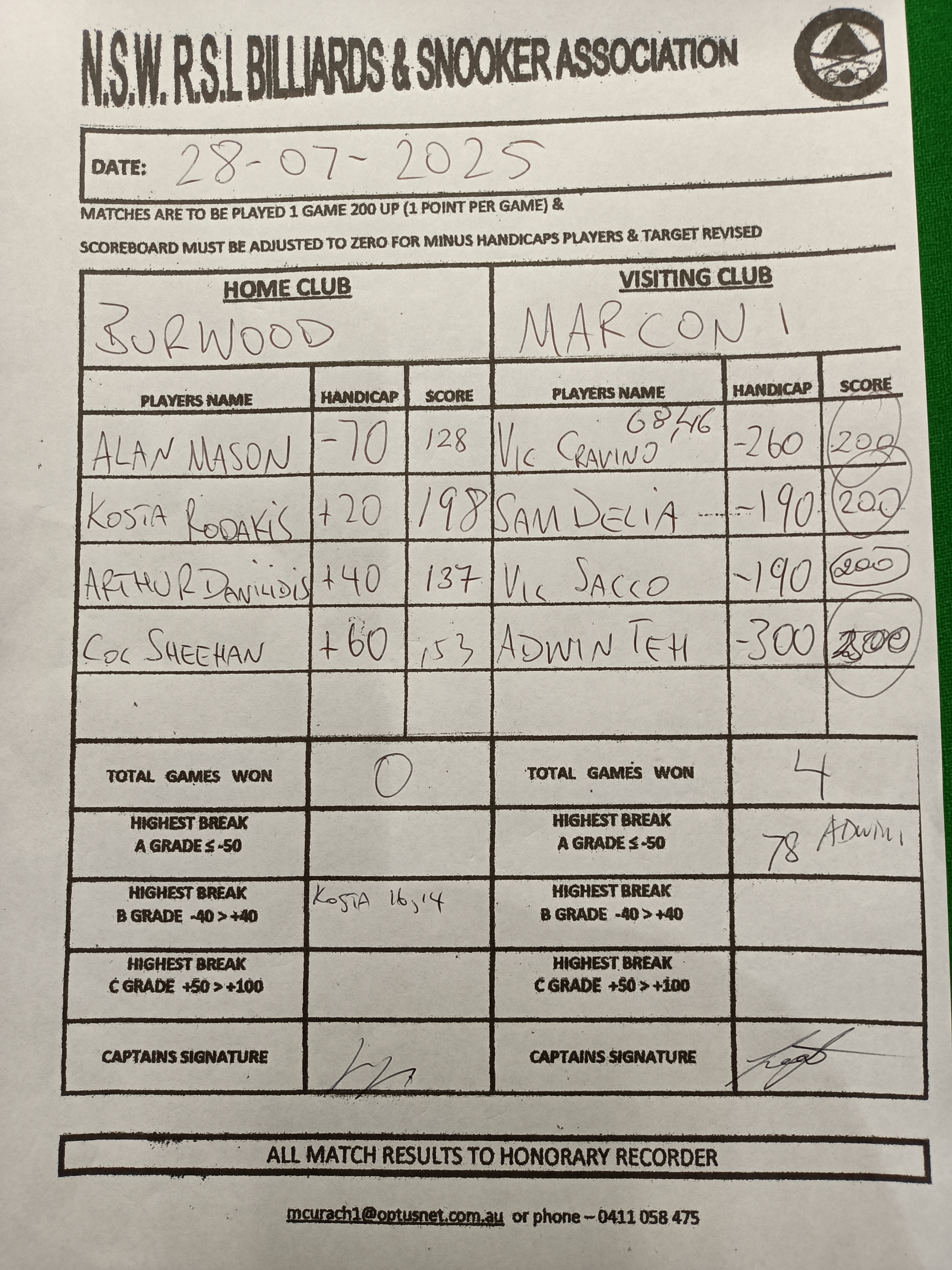 | POS | Burwood | Score | PTS | Break | Marconi | Score | PTS | Breaks | Result Note | Updated on | Update by |