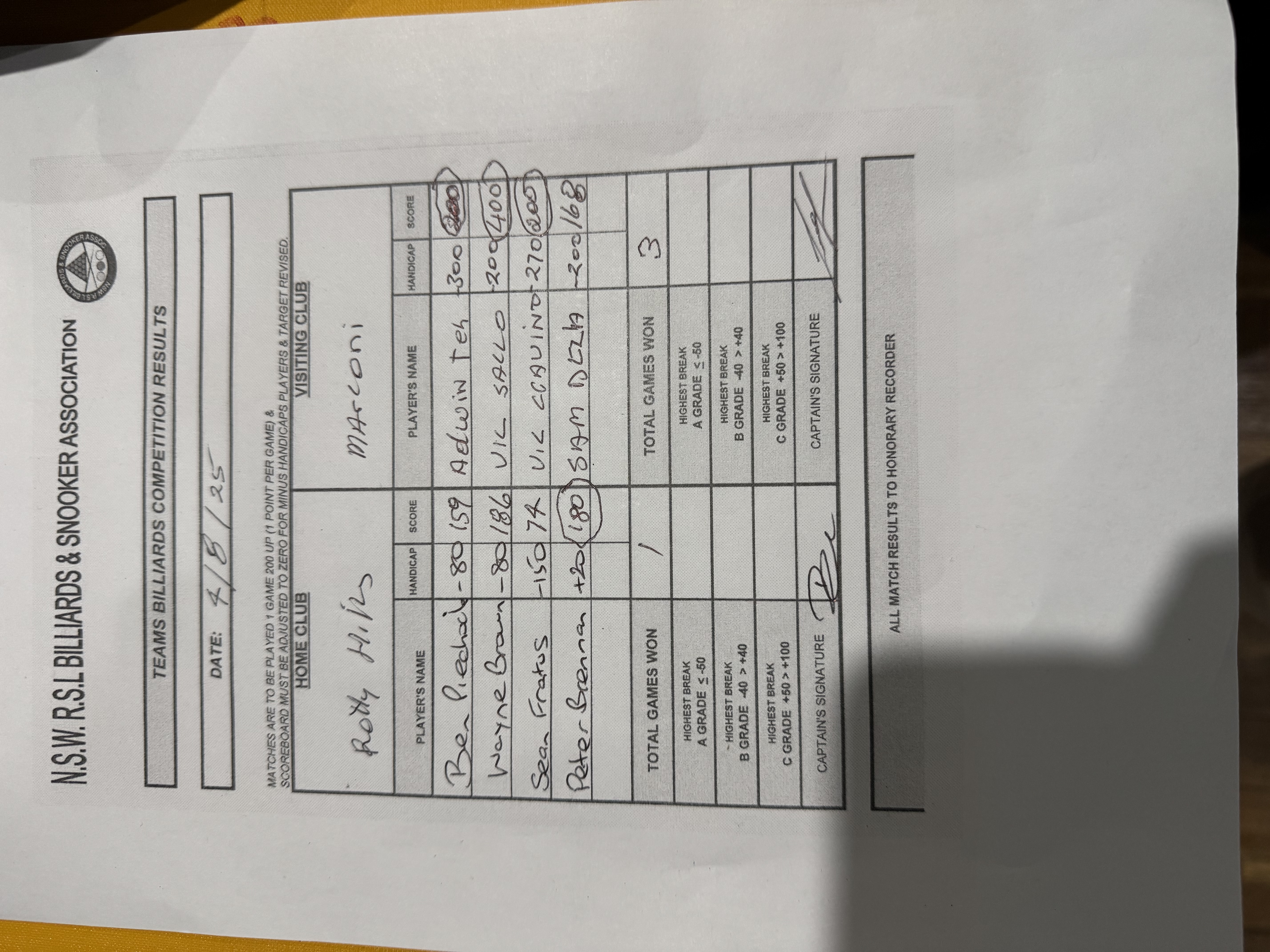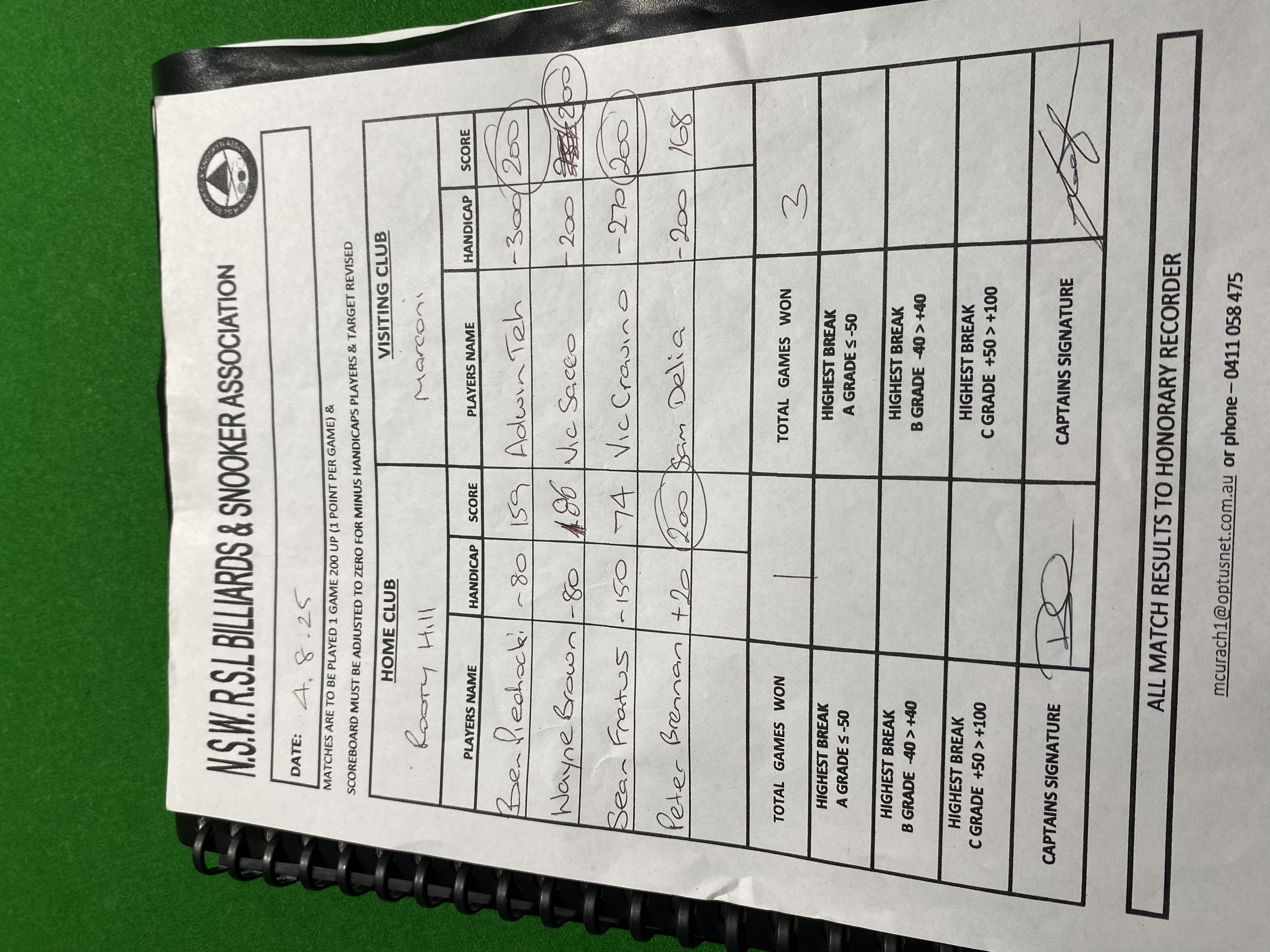 | Peter Brennan (20) | Sam Delia (-200) | 2025-08-04 22:33:16 | Div1 - Marconi |