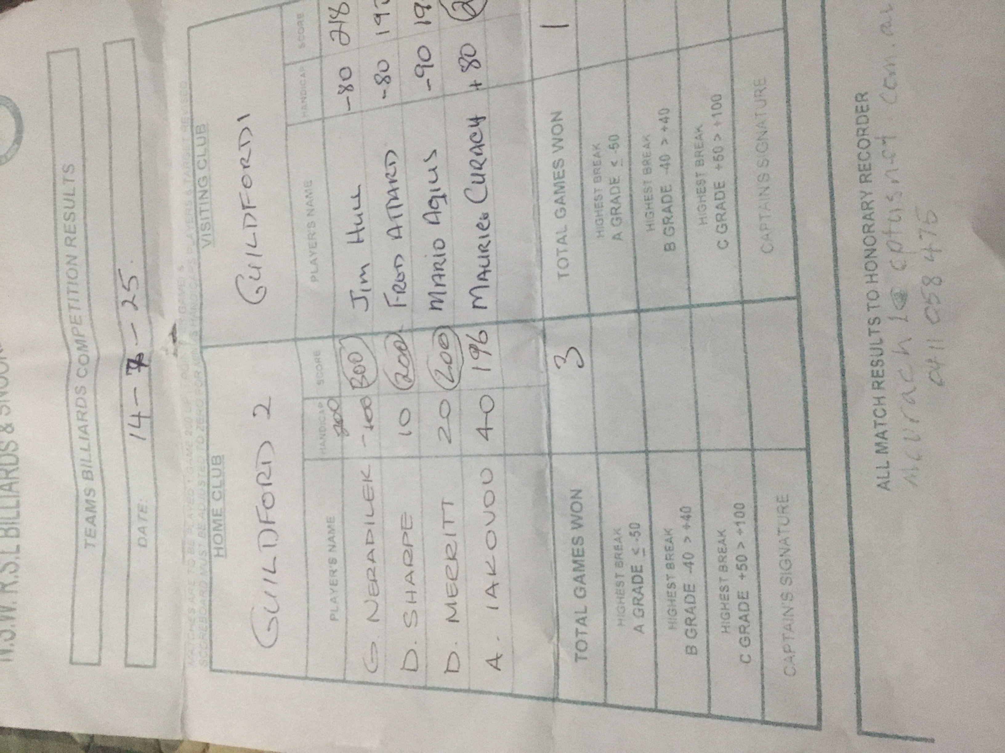 | POS | Guildford #2 | Score | PTS | Break | Guildford #1 | Score | PTS | Breaks | Result Note | Updated on | Update by |