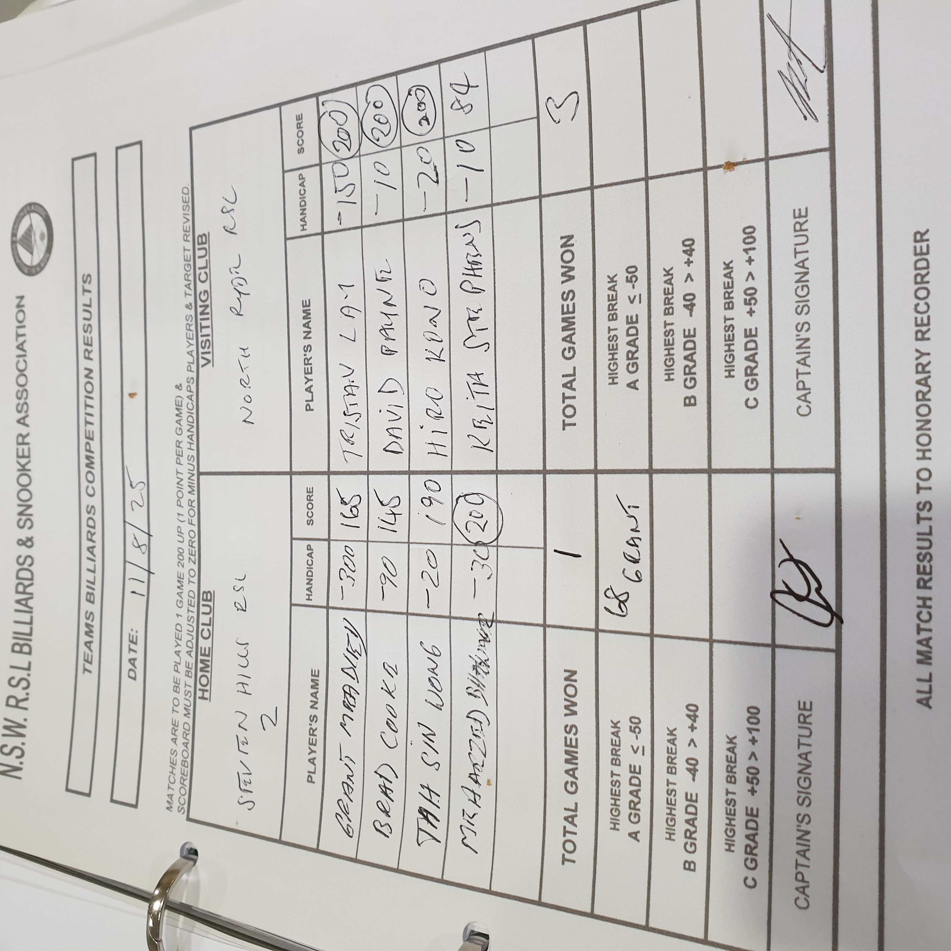 | Grant Meadley (-300) | Tristan Lau (-150) | 2025-08-12 08:51:28 | Div1 - North Ryde | ||||||||