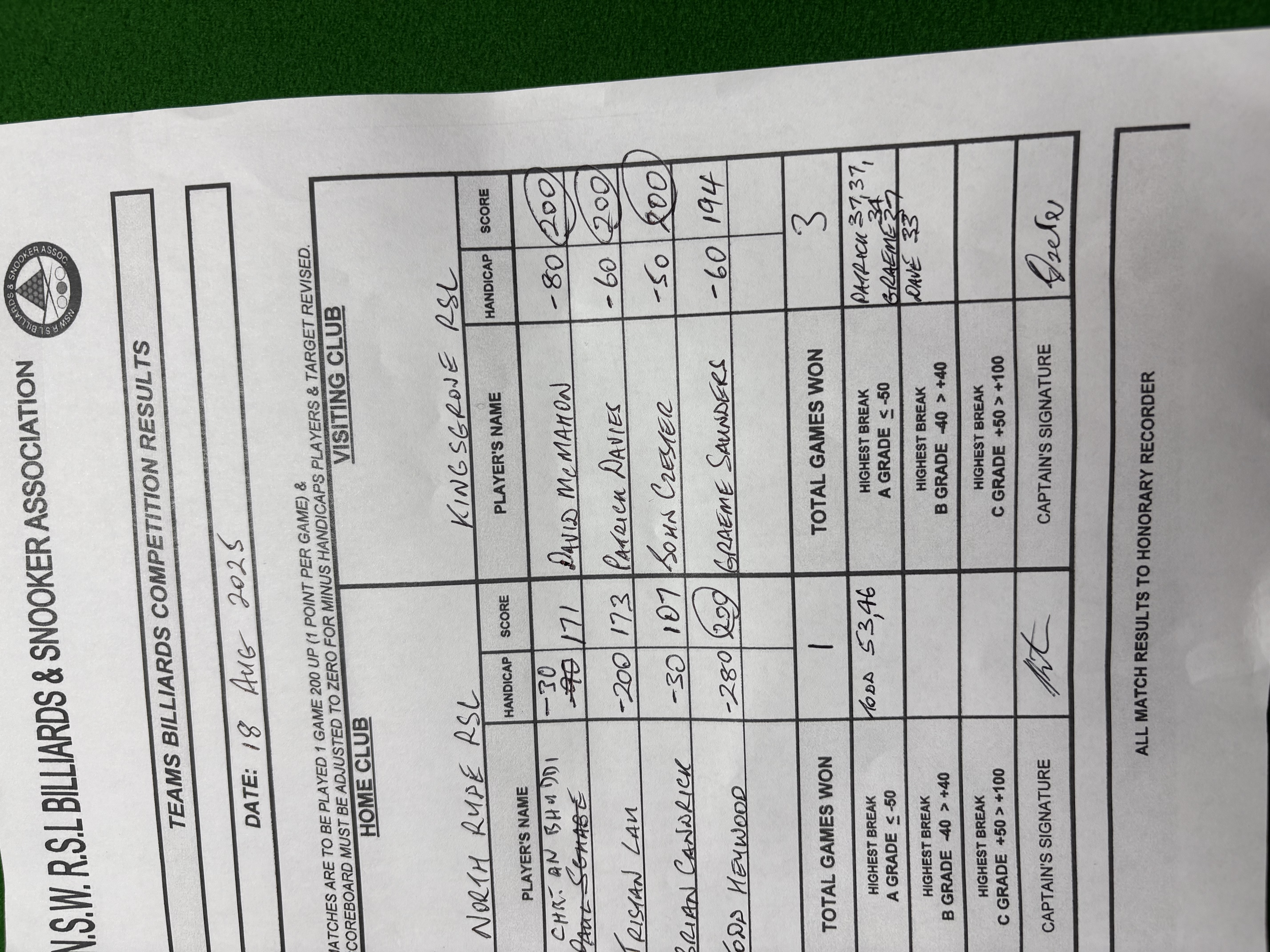 | Todd Haywood (-280) | Graeme Saunders (-60) | 2025-08-19 09:26:01 | Div1 - North Ryde |
