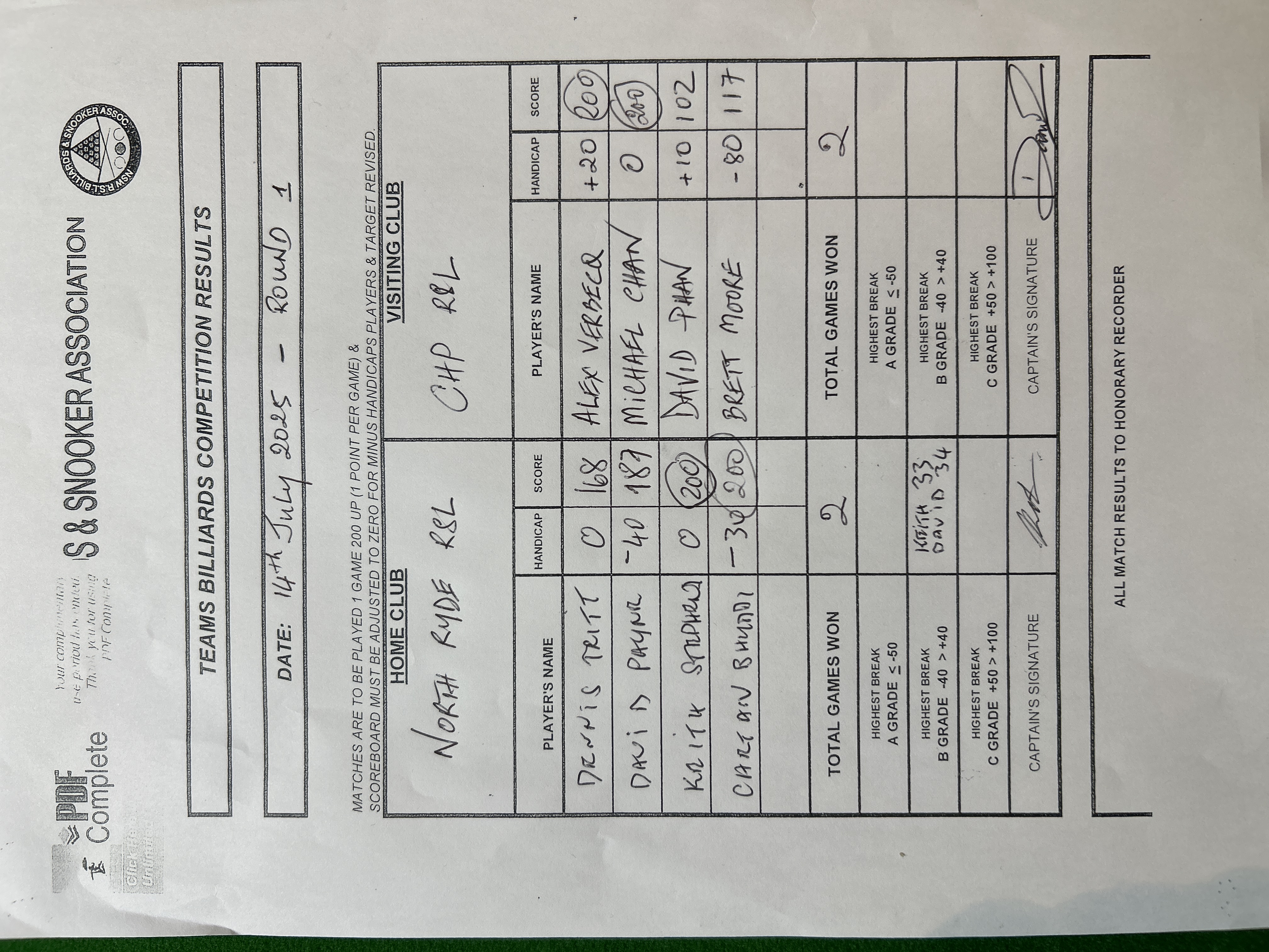 | Keith Stephens (0) | David Phan (10) | 2025-07-14 21:41:08 | Div1 - Canterbury H/P | ||||||||