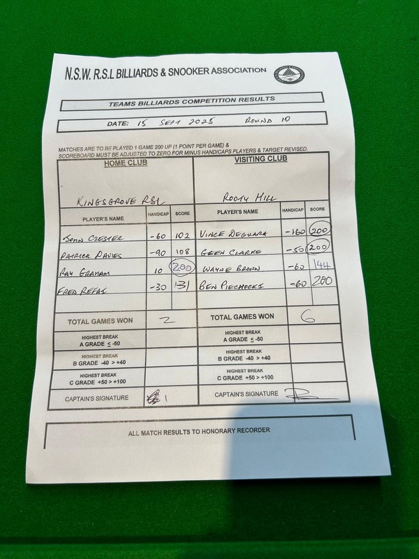 | Raymond Graham (10) | Wayne Brown (-60) | 2025-09-16 11:18:57 | Div1 - Kingsgrove | ||||||||