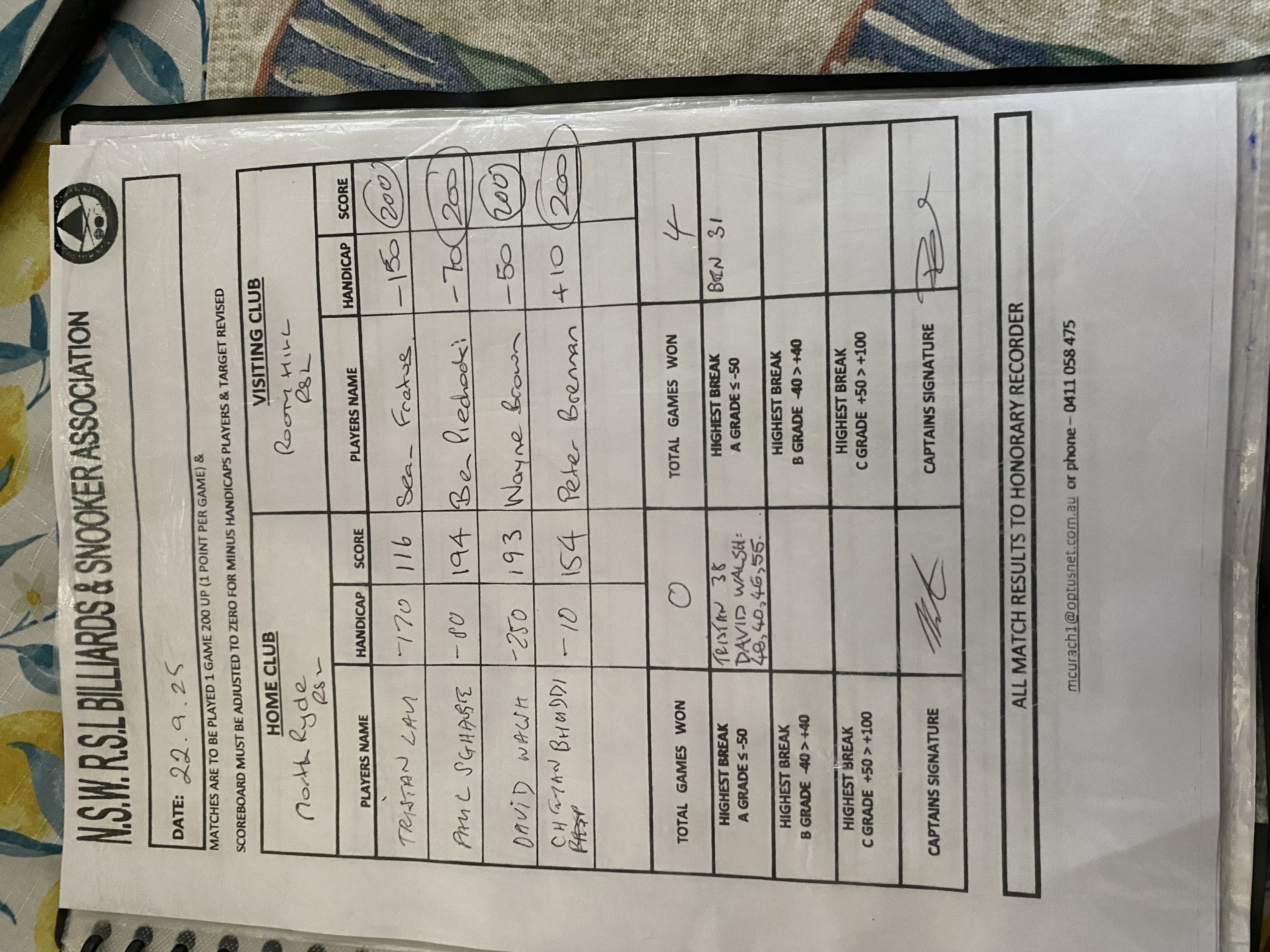 | David Walsh (-250) | Wayne Brown (-50) | David 48 40 46 55 breaks | 2025-09-23 07:44:10 | Div1 - Rooty Hill | |||||||