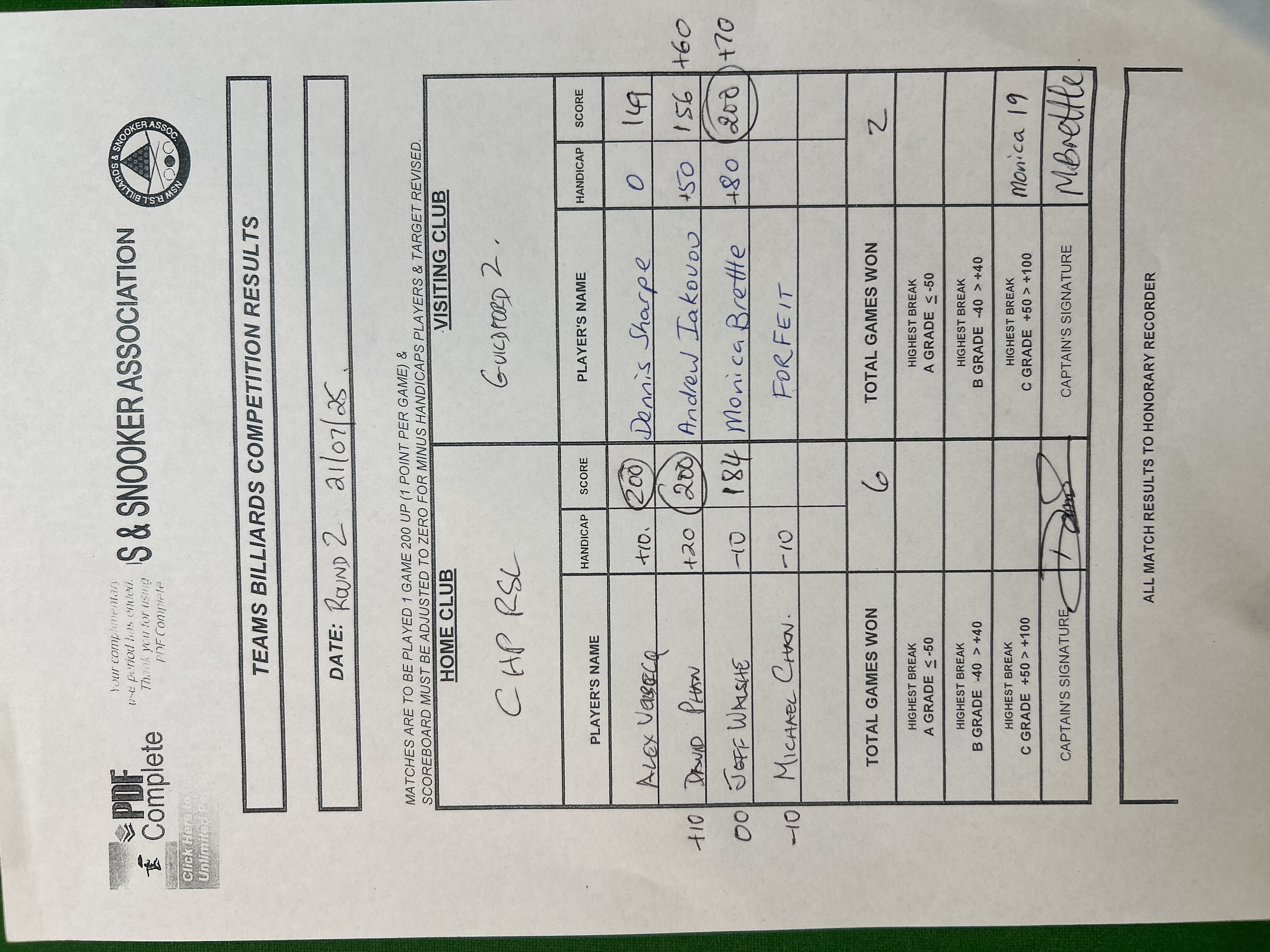 | Michael Chan (-10) | FORFEIT () | 2025-07-22 11:57:01 | Div1 - Guildford #2 |