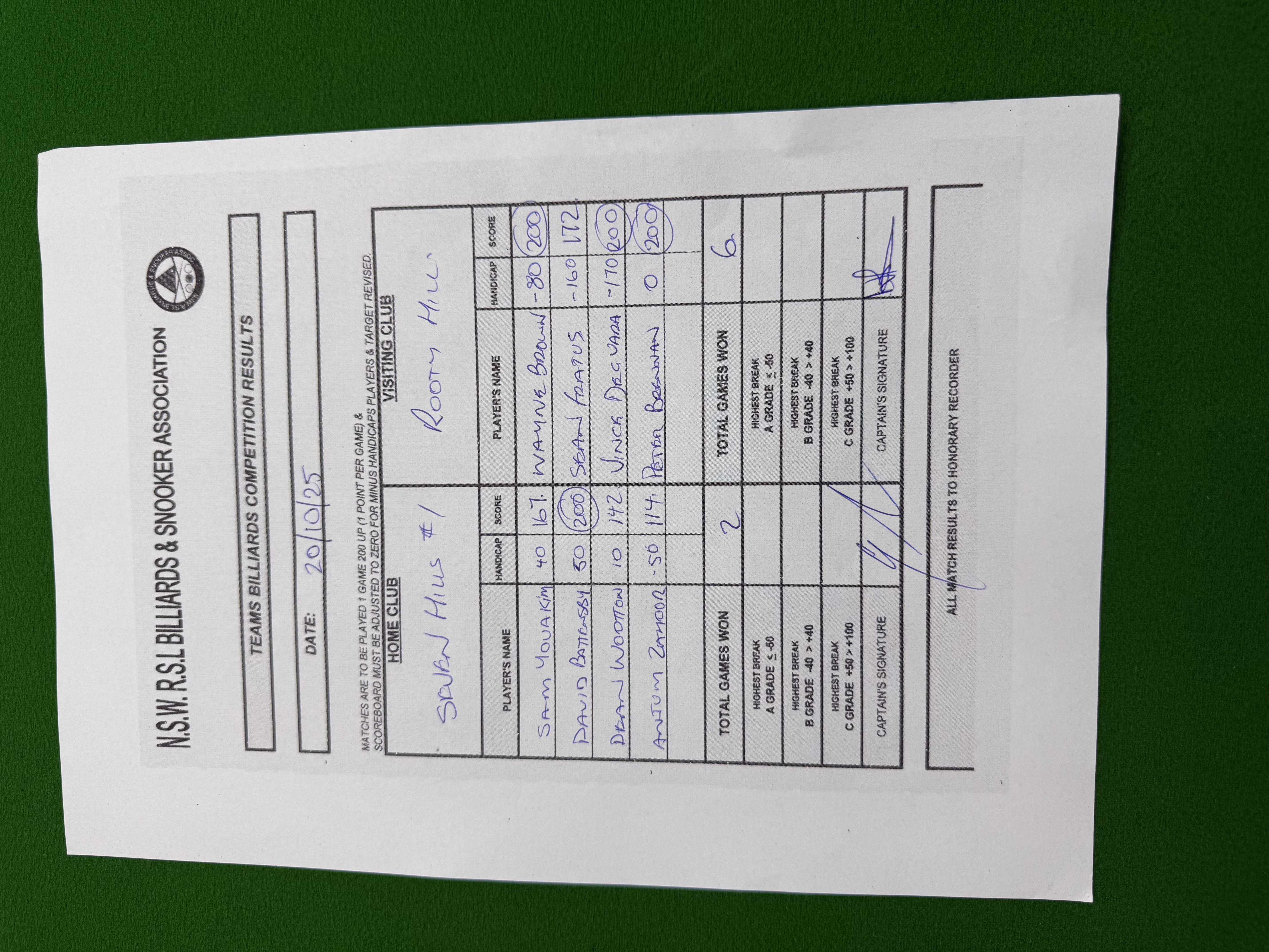 | David Battensby (50) | Sean Fratus (-160) | 2025-10-21 17:13:49 | Div1 - Seven Hills #1 | ||||||||