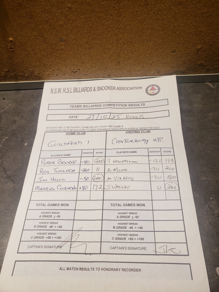 | Ron Tulloch (-260) | Brett Moore (-70) | 2025-10-27 20:51:28 | Div1 - Canterbury H/P | ||||||||