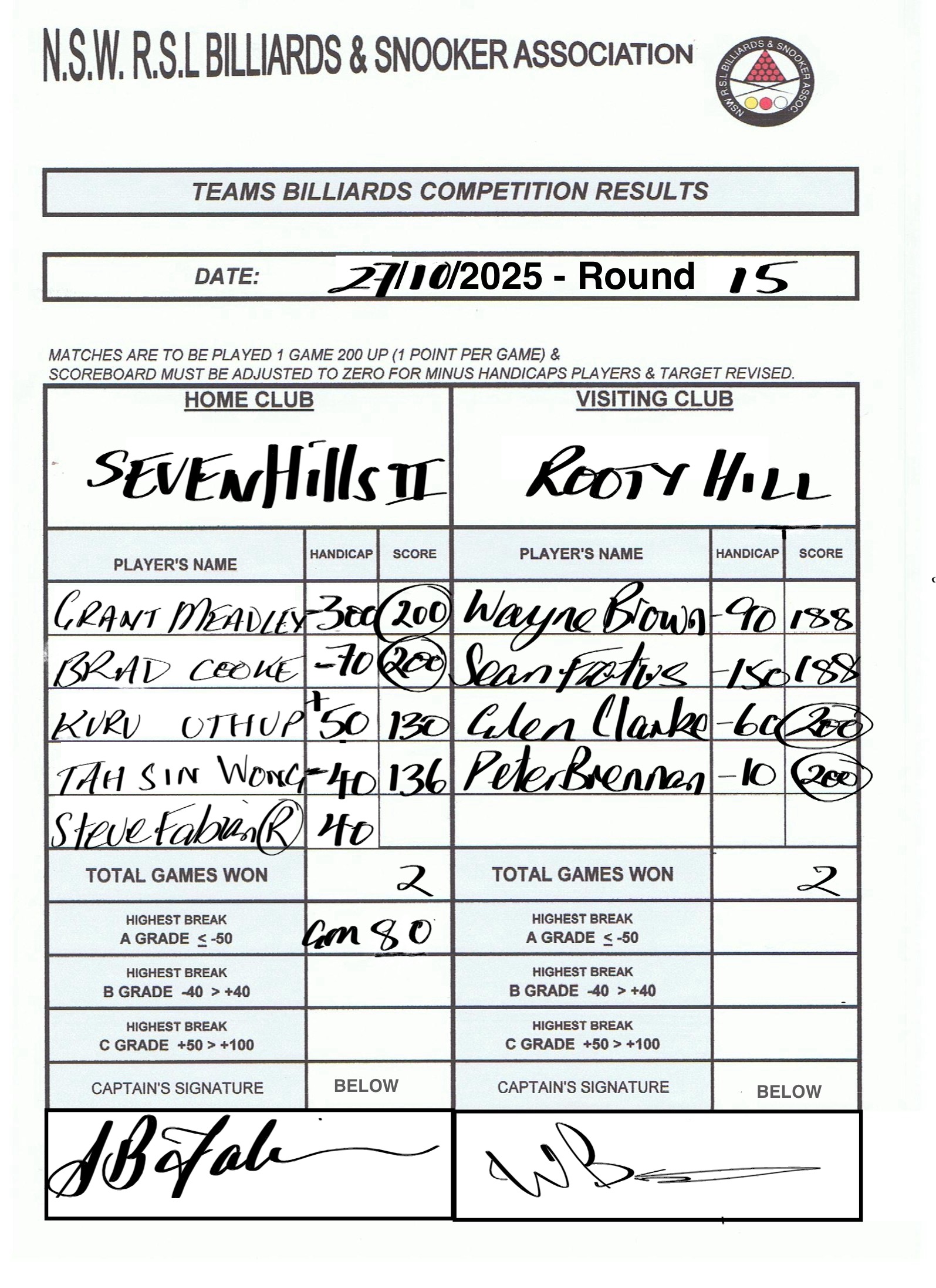 | Grant Meadley (-300) | Wayne Brown (-90) | 2025-10-27 23:13:35 | Div1 - Seven Hills #2 | ||||||||