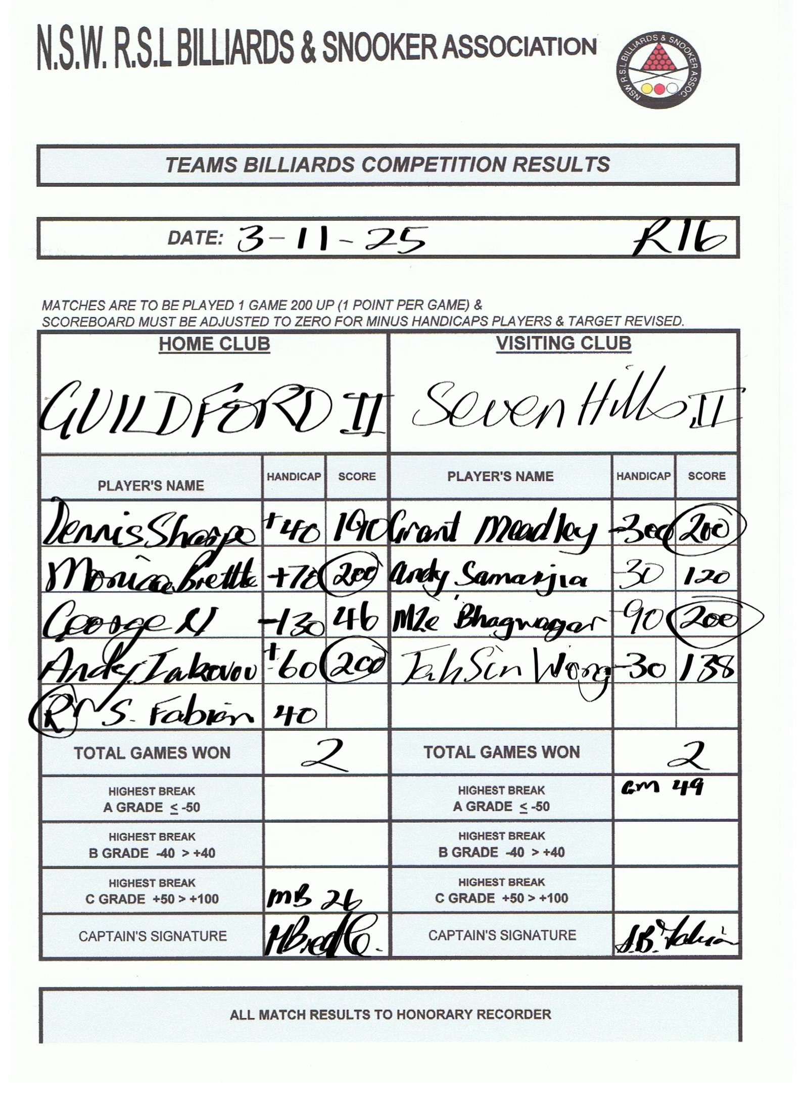 | POS | Guildford #2 | Score | PTS | Break | Seven Hills #2 | Score | PTS | Breaks | Result Note | Updated on | Update by |