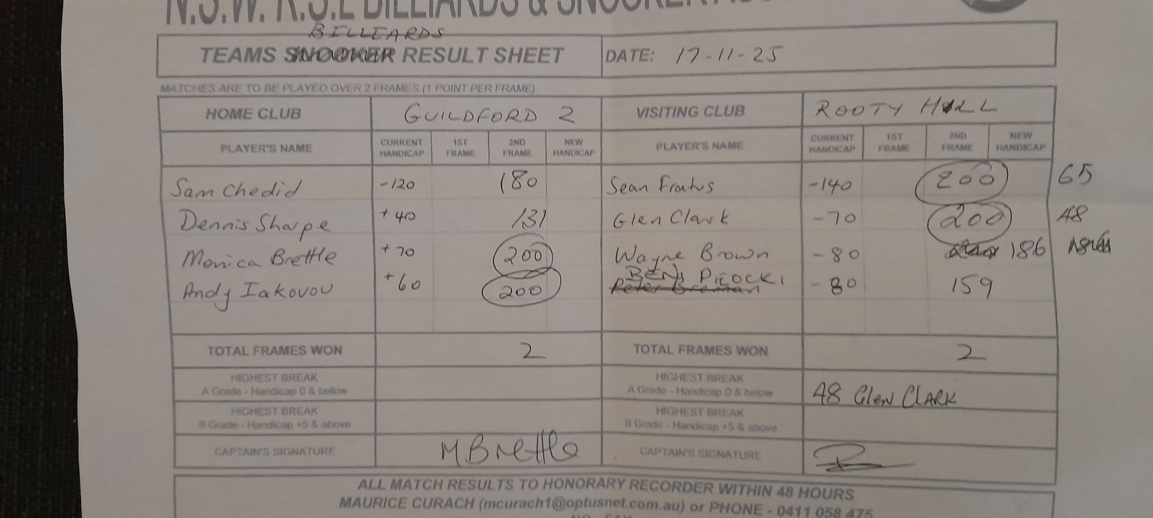 | POS | Guildford #2 | Score | PTS | Break | Rooty Hill | Score | PTS | Breaks | Result Note | Updated on | Update by |