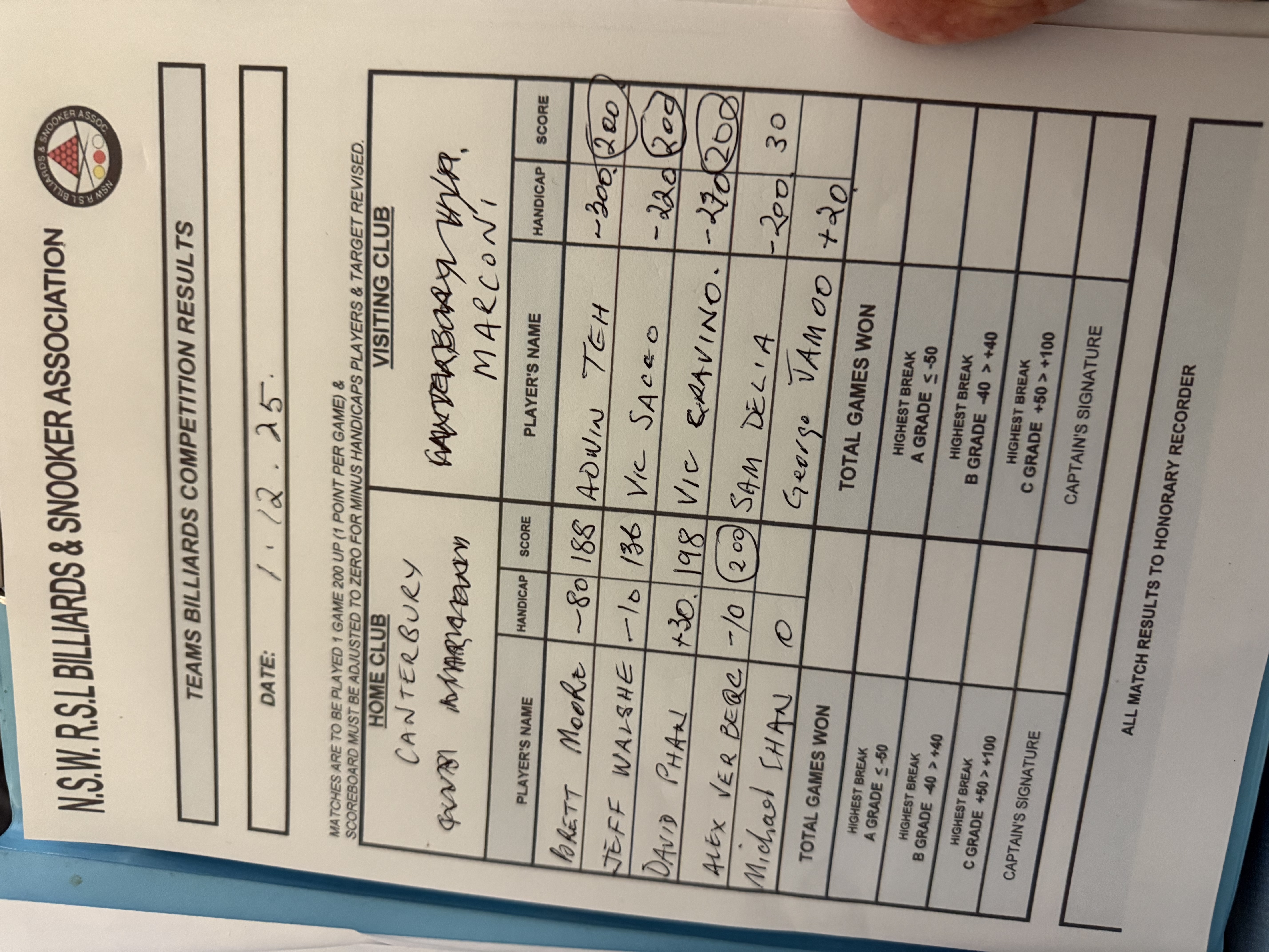 | POS | Marconi | Score | PTS | Break | Canterbury H/P | Score | PTS | Breaks | Result Note | Updated on | Update by |