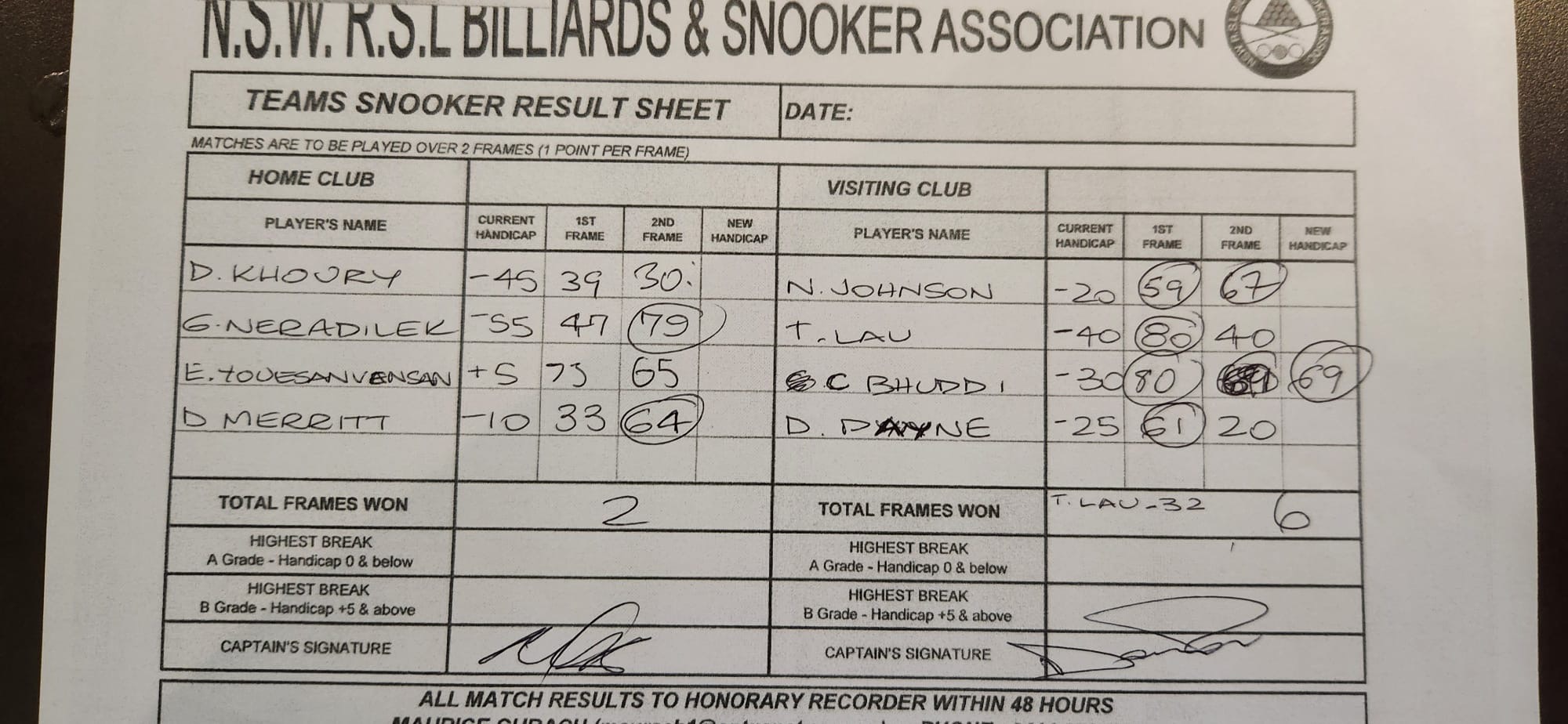 | POS | Kingsgrove | Frame 1 | Net | Frame 2 | Net | PTS | Breaks | North Ryde | Frame 1 | Net | Frame 2 | Net | PTS | Breaks | Result Note | Updated on | Update by |