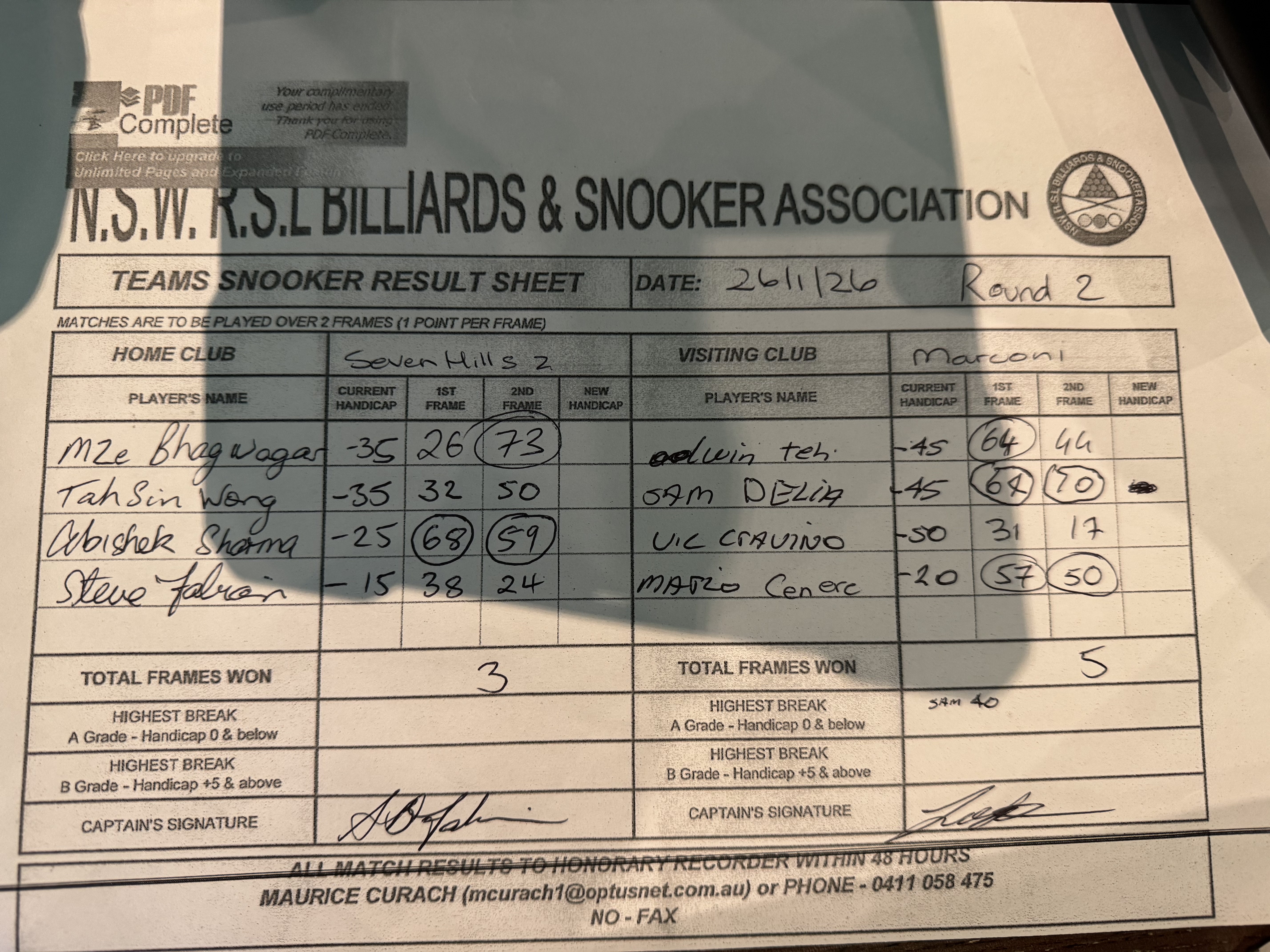 | POS | Seven Hills #2 | Frame 1 | Net | Frame 2 | Net | PTS | Breaks | Marconi | Frame 1 | Net | Frame 2 | Net | PTS | Breaks | Result Note | Updated on | Update by |
