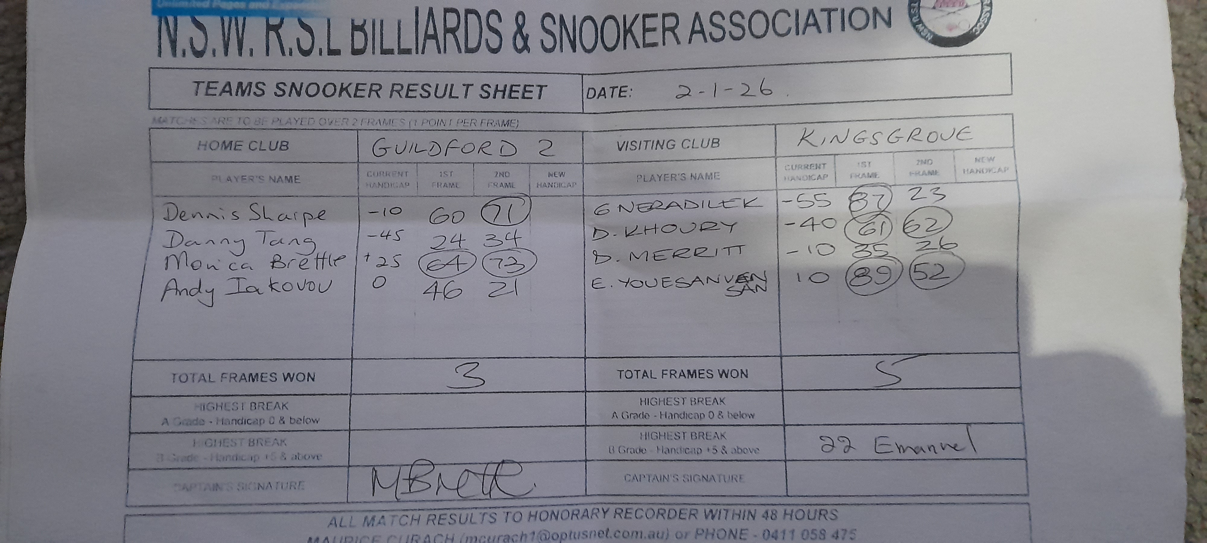 | POS | Guildford #2 | Frame 1 | Net | Frame 2 | Net | PTS | Breaks | Kingsgrove | Frame 1 | Net | Frame 2 | Net | PTS | Breaks | Result Note | Updated on | Update by |