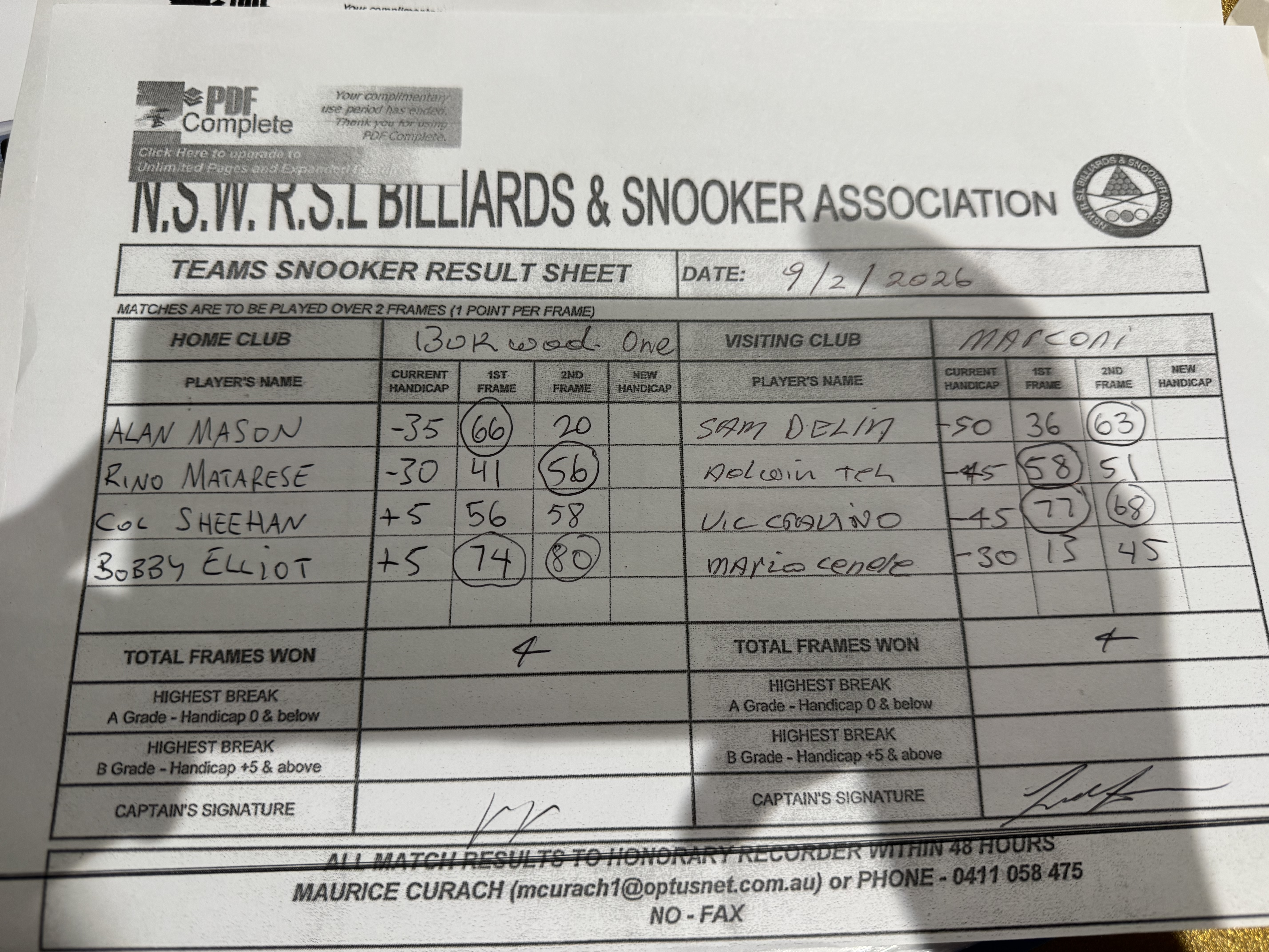 | POS | Burwood #1 | Frame 1 | Net | Frame 2 | Net | PTS | Breaks | Marconi | Frame 1 | Net | Frame 2 | Net | PTS | Breaks | Result Note | Updated on | Update by |