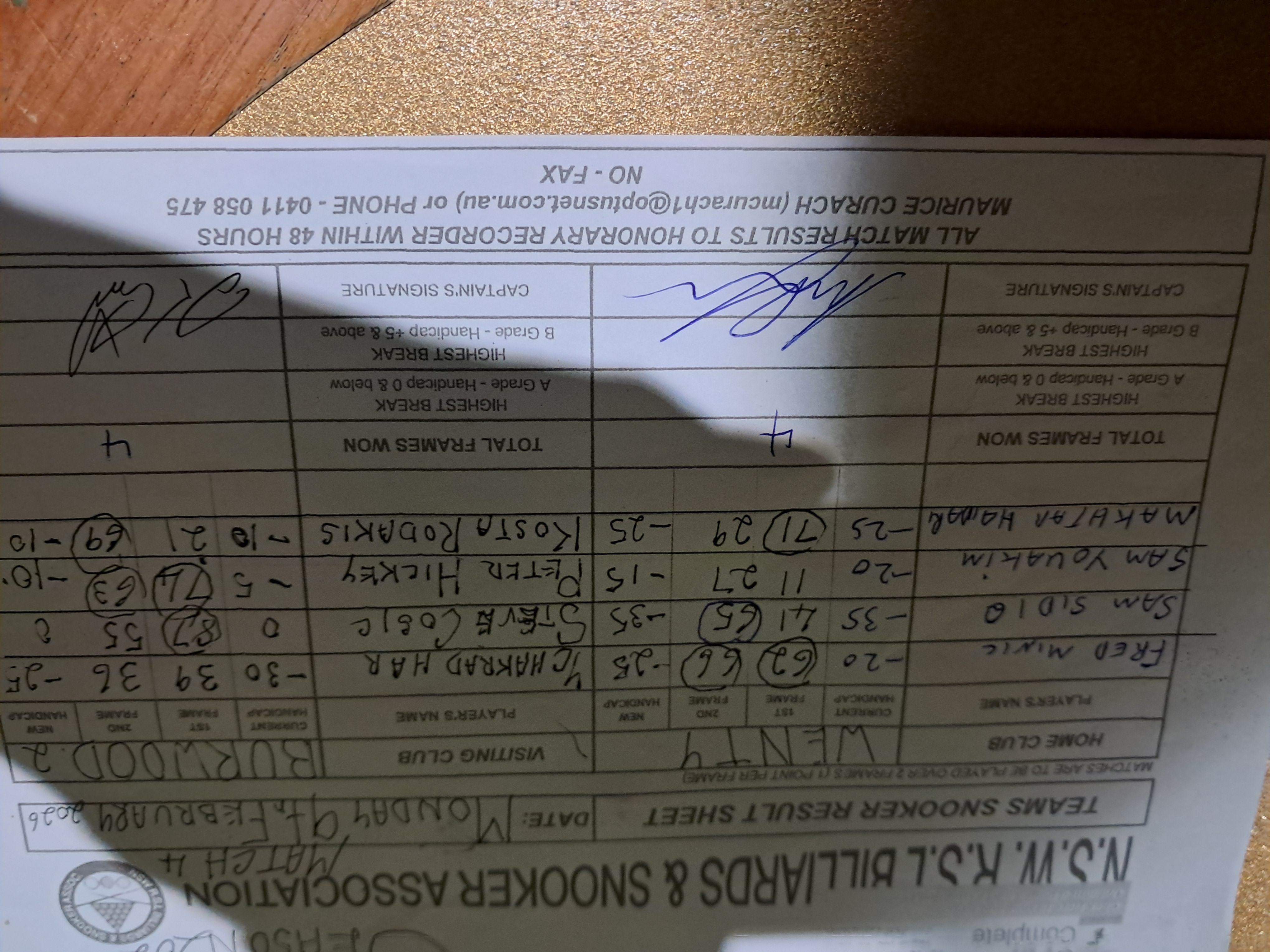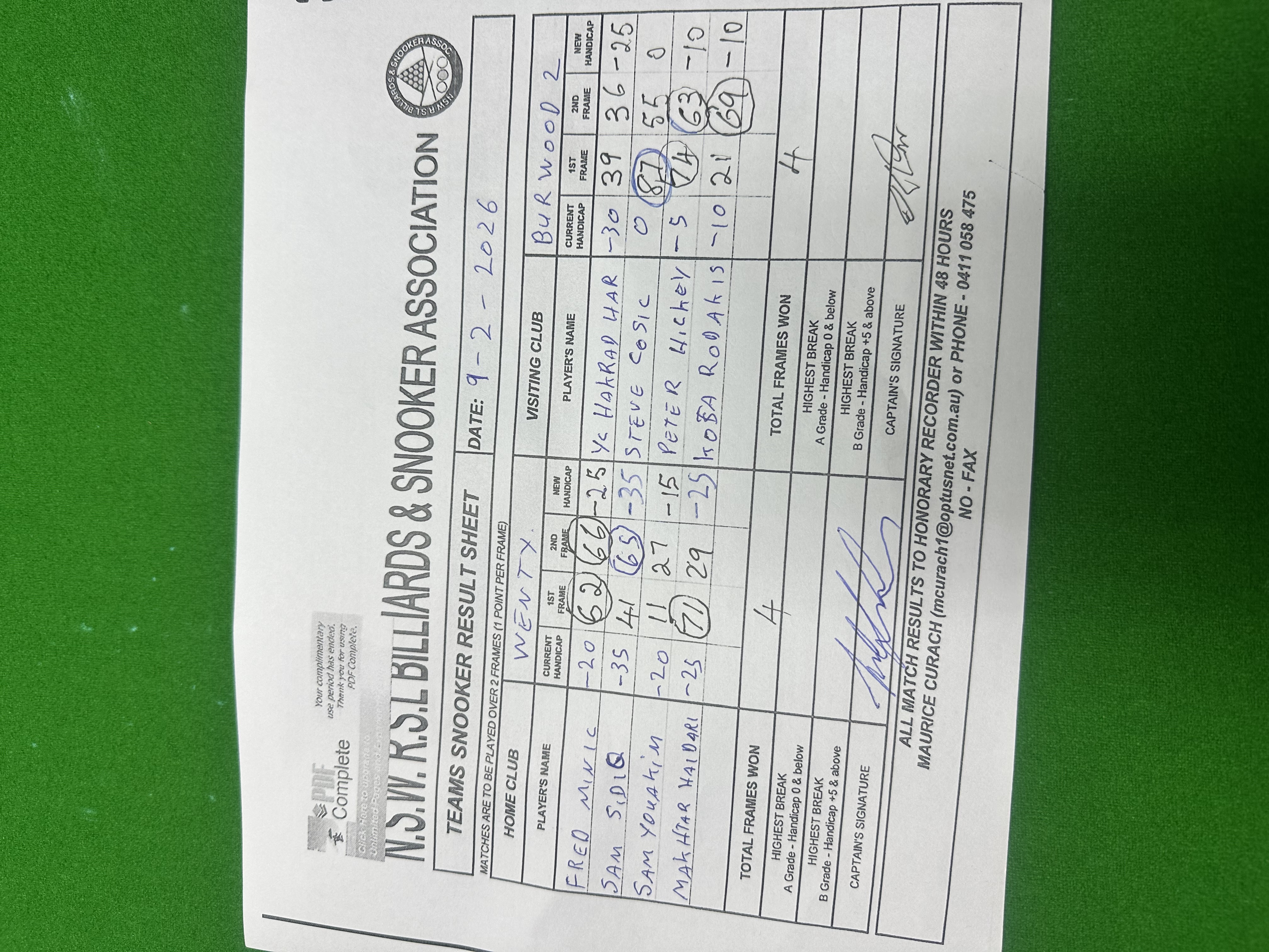 | Sam Sidiq (-35) | Stephen Cosic (0) | 2026-02-10 17:16:35 | Burwood #2 | ||||||||||||||