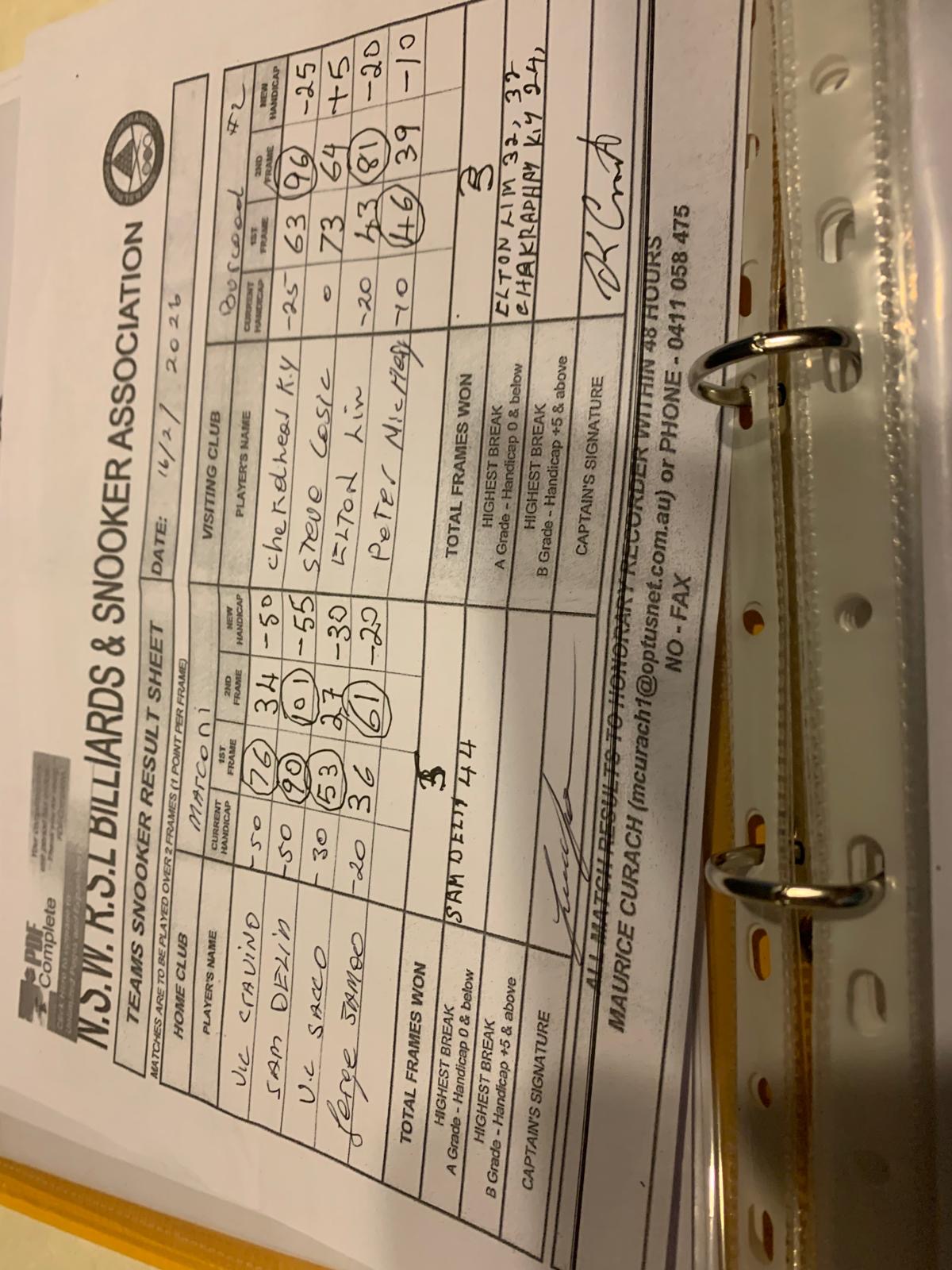 | POS | Marconi | Frame 1 | Net | Frame 2 | Net | PTS | Breaks | Burwood #2 | Frame 1 | Net | Frame 2 | Net | PTS | Breaks | Result Note | Updated on | Update by |