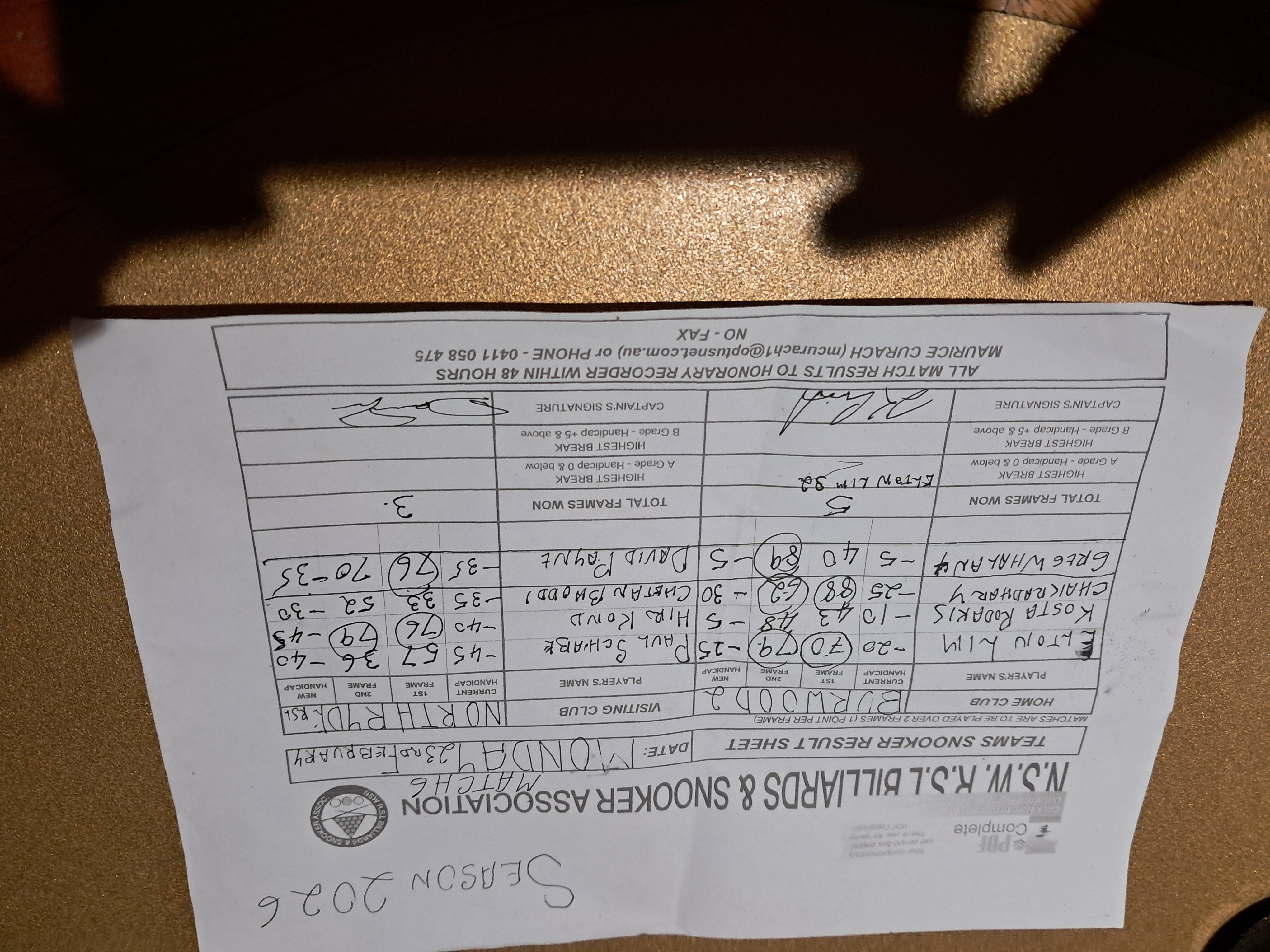 | Greg Whalan (-5) | David Payne (-35) | 2026-02-24 02:16:35 | Burwood #2 |