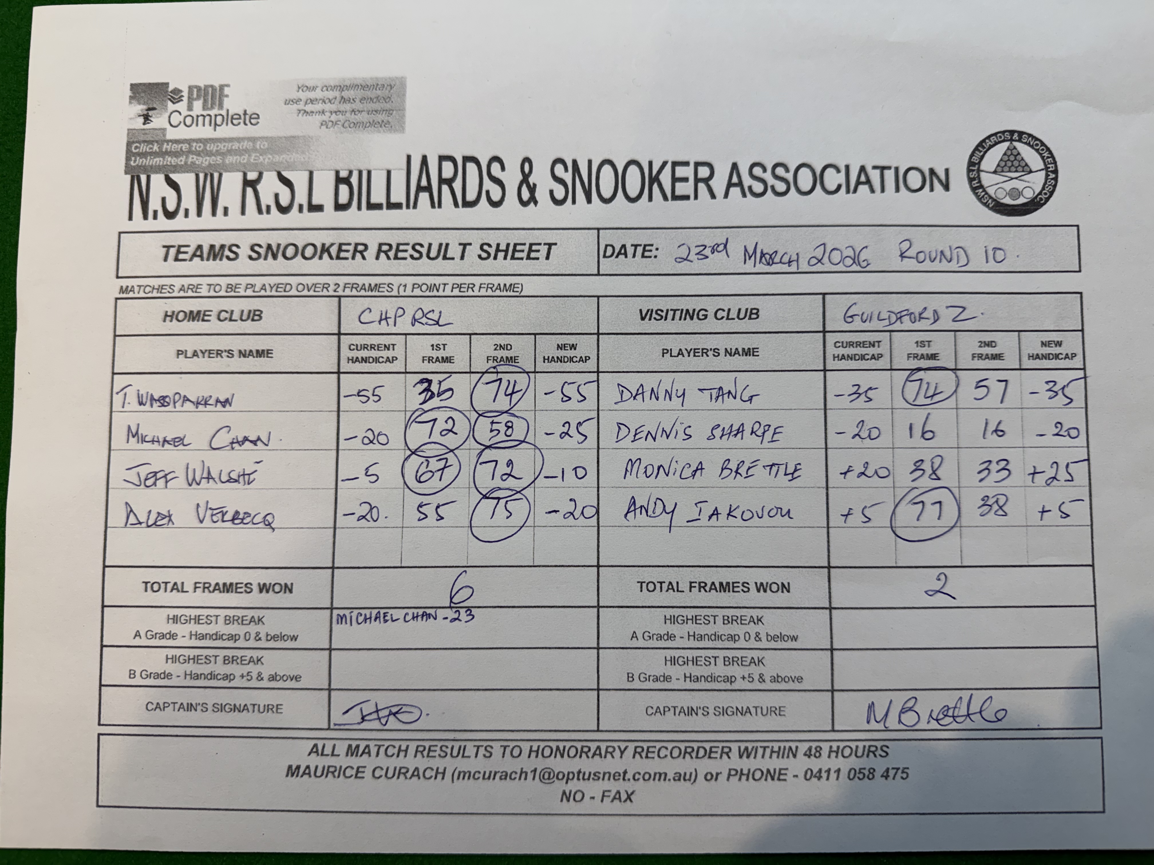 | POS | Canterbury H/P | Frame 1 | Net | Frame 2 | Net | PTS | Breaks | Guildford #2 | Frame 1 | Net | Frame 2 | Net | PTS | Breaks | Result Note | Updated on | Update by |