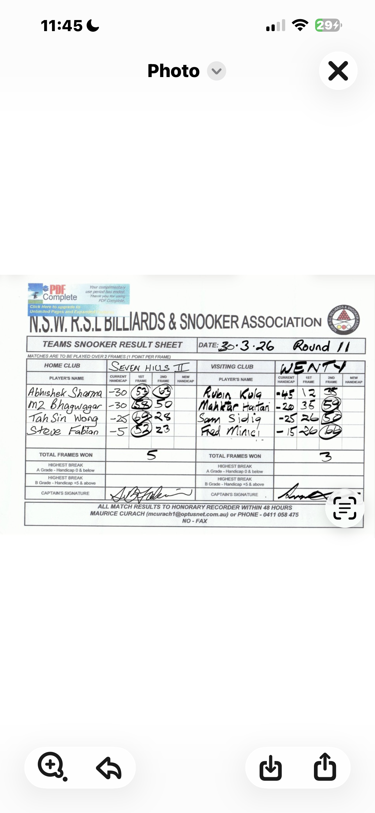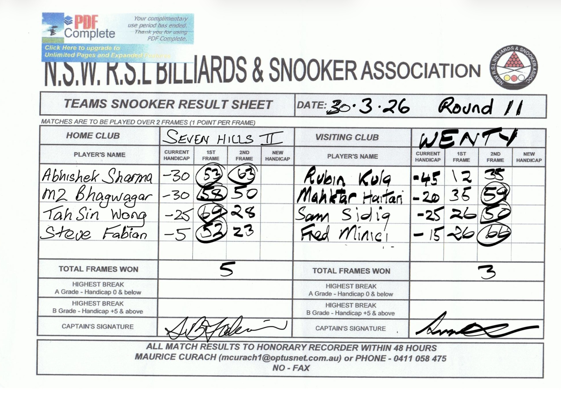 | POS | Seven Hills #2 | Frame 1 | Net | Frame 2 | Net | PTS | Breaks | Wenty | Frame 1 | Net | Frame 2 | Net | PTS | Breaks | Result Note | Updated on | Update by |