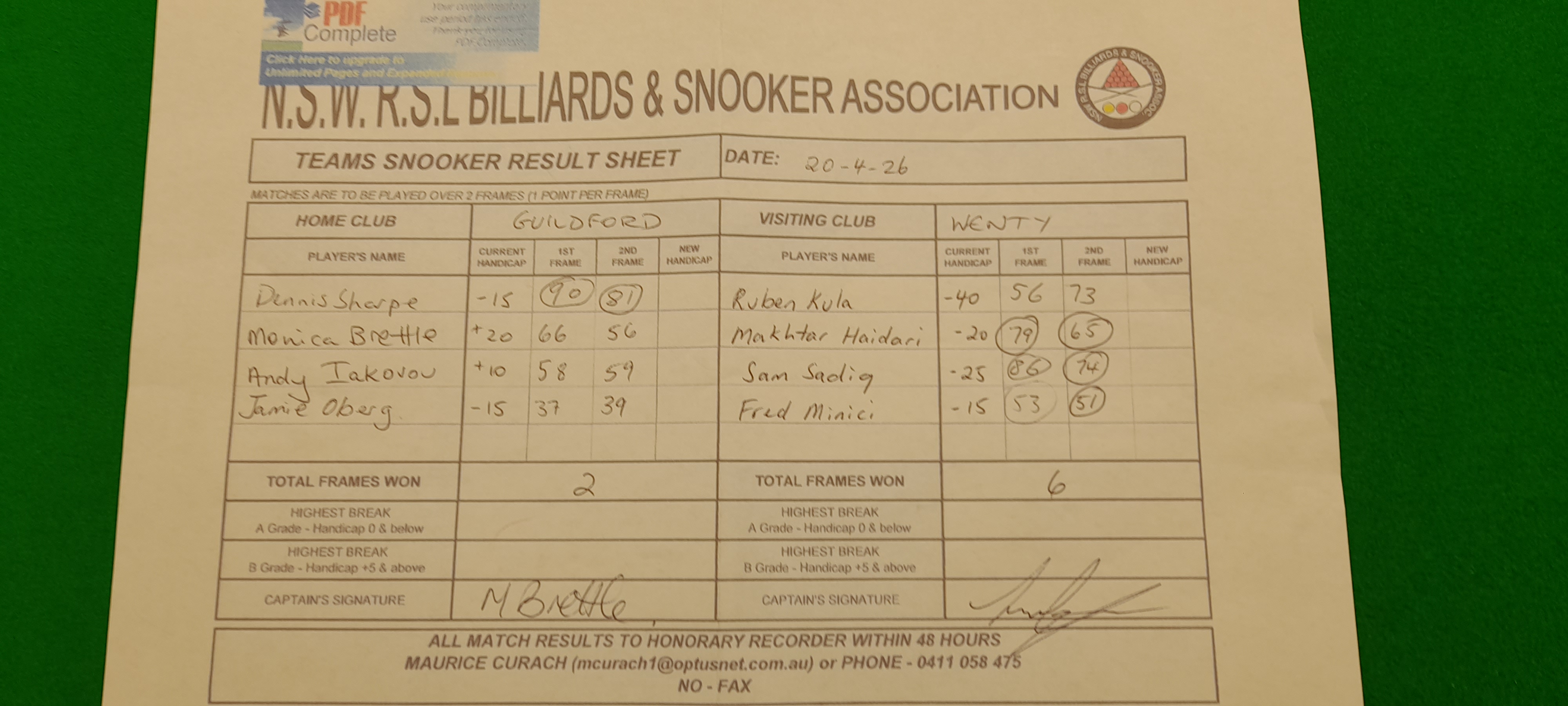 | Monica Brettle (20) | Makhtar Haidari (-20) | 2026-04-21 12:37:54 | Guildford #2 | ||||||||||||||