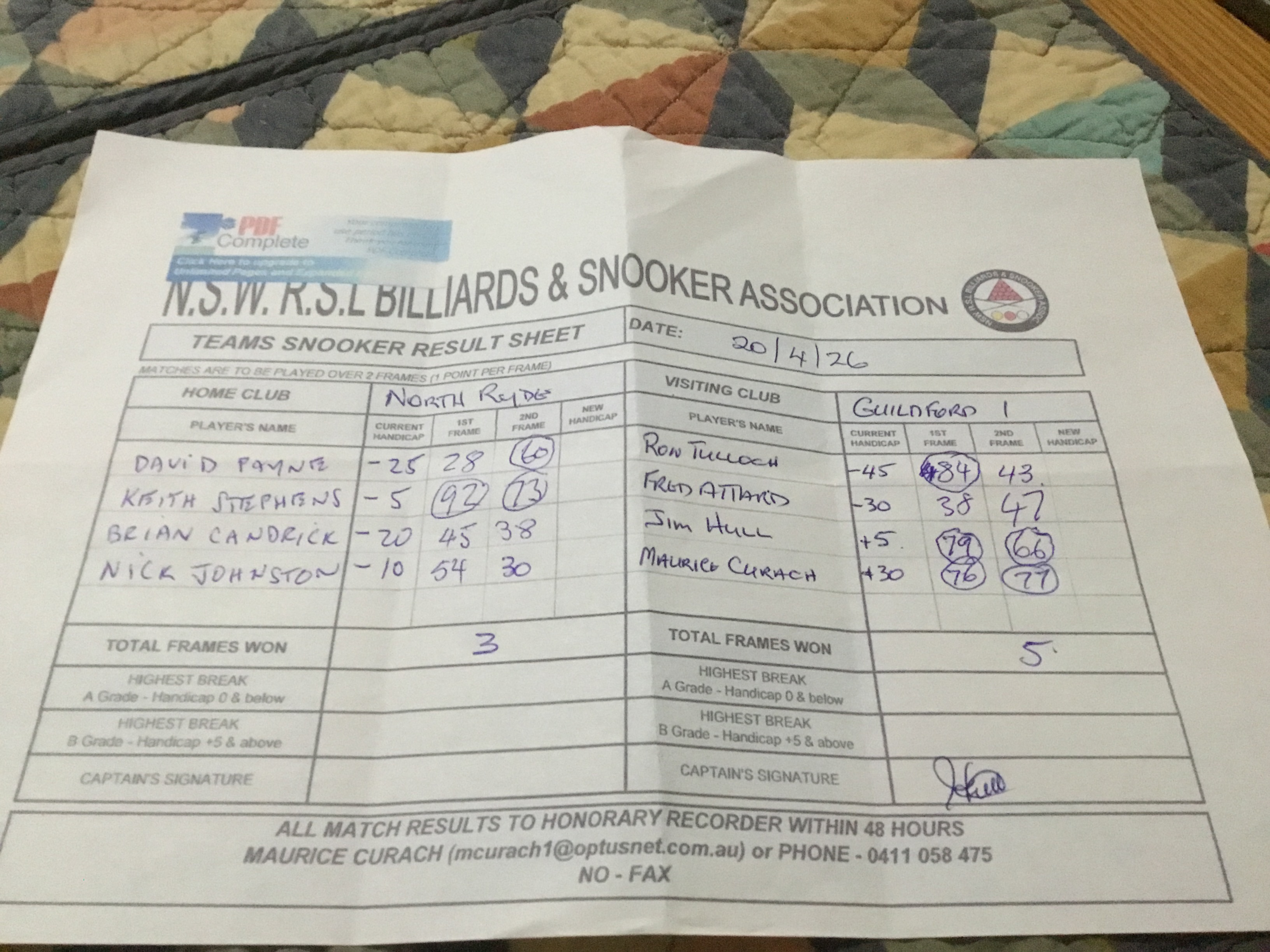 | POS | North Ryde | Frame 1 | Net | Frame 2 | Net | PTS | Breaks | Guildford #1 | Frame 1 | Net | Frame 2 | Net | PTS | Breaks | Result Note | Updated on | Update by |
