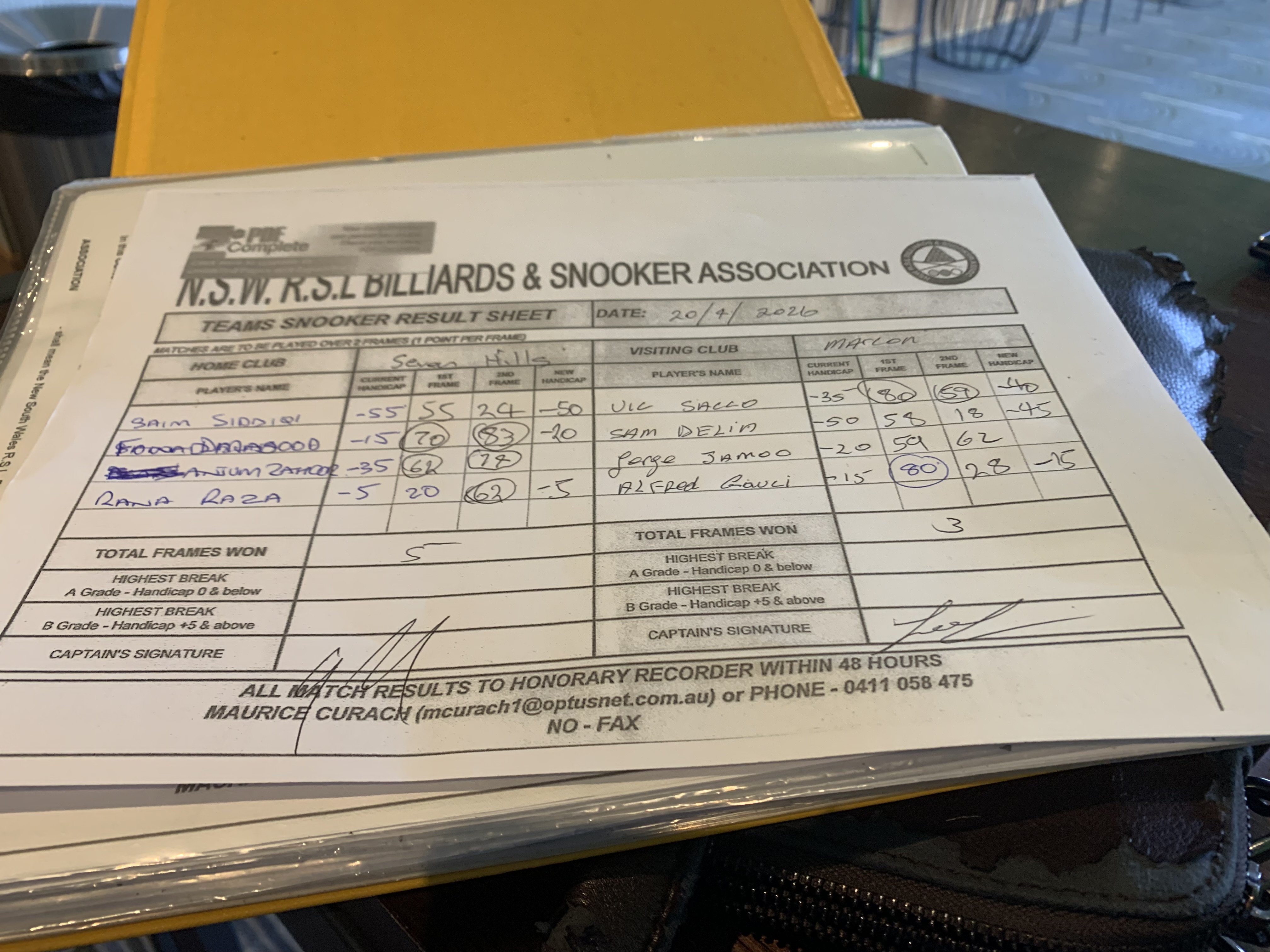 | POS | Seven Hills #1 | Frame 1 | Net | Frame 2 | Net | PTS | Breaks | Marconi | Frame 1 | Net | Frame 2 | Net | PTS | Breaks | Result Note | Updated on | Update by |