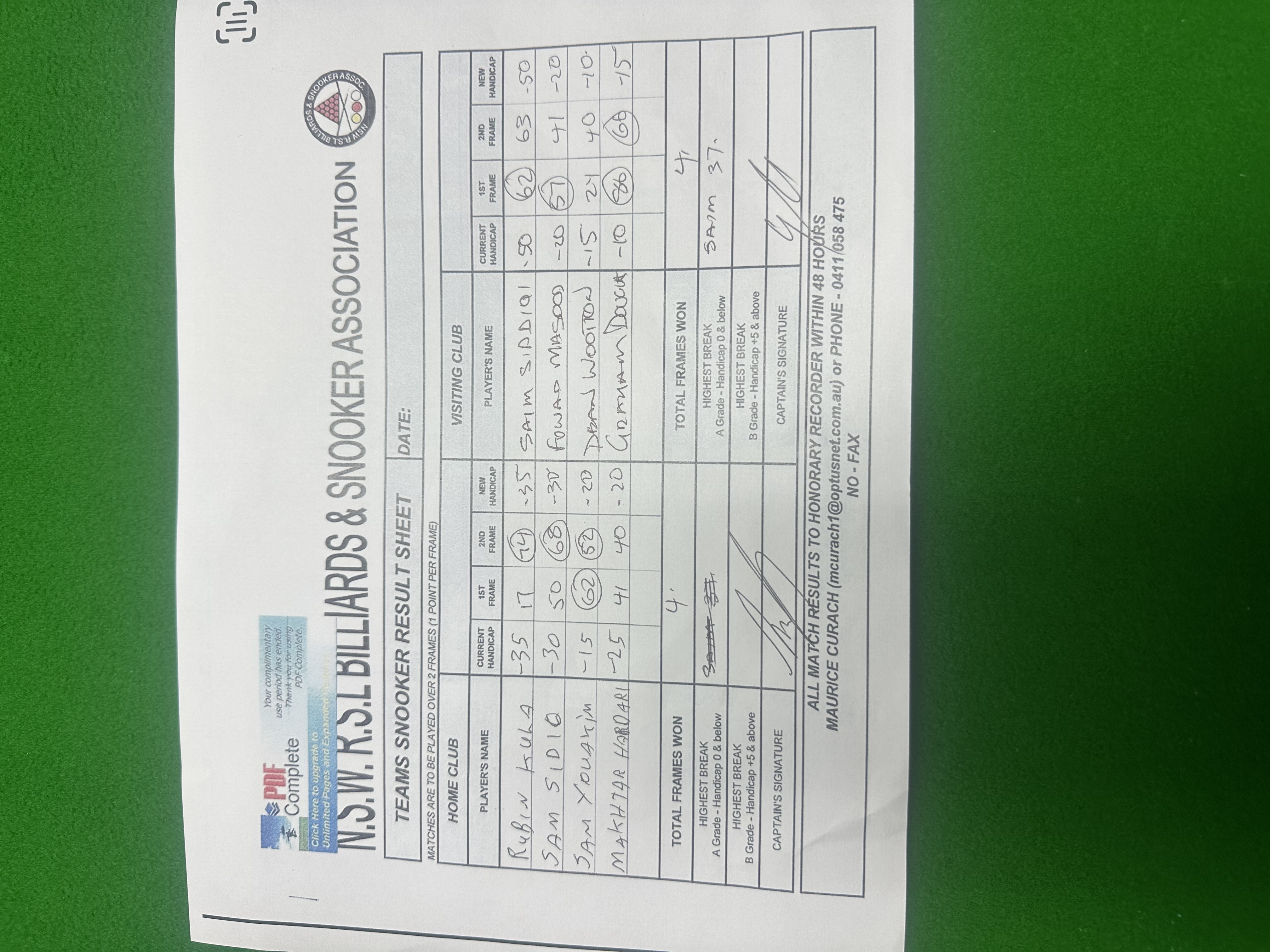 | POS | Wenty | Frame 1 | Net | Frame 2 | Net | PTS | Breaks | Seven Hills #1 | Frame 1 | Net | Frame 2 | Net | PTS | Breaks | Result Note | Updated on | Update by |