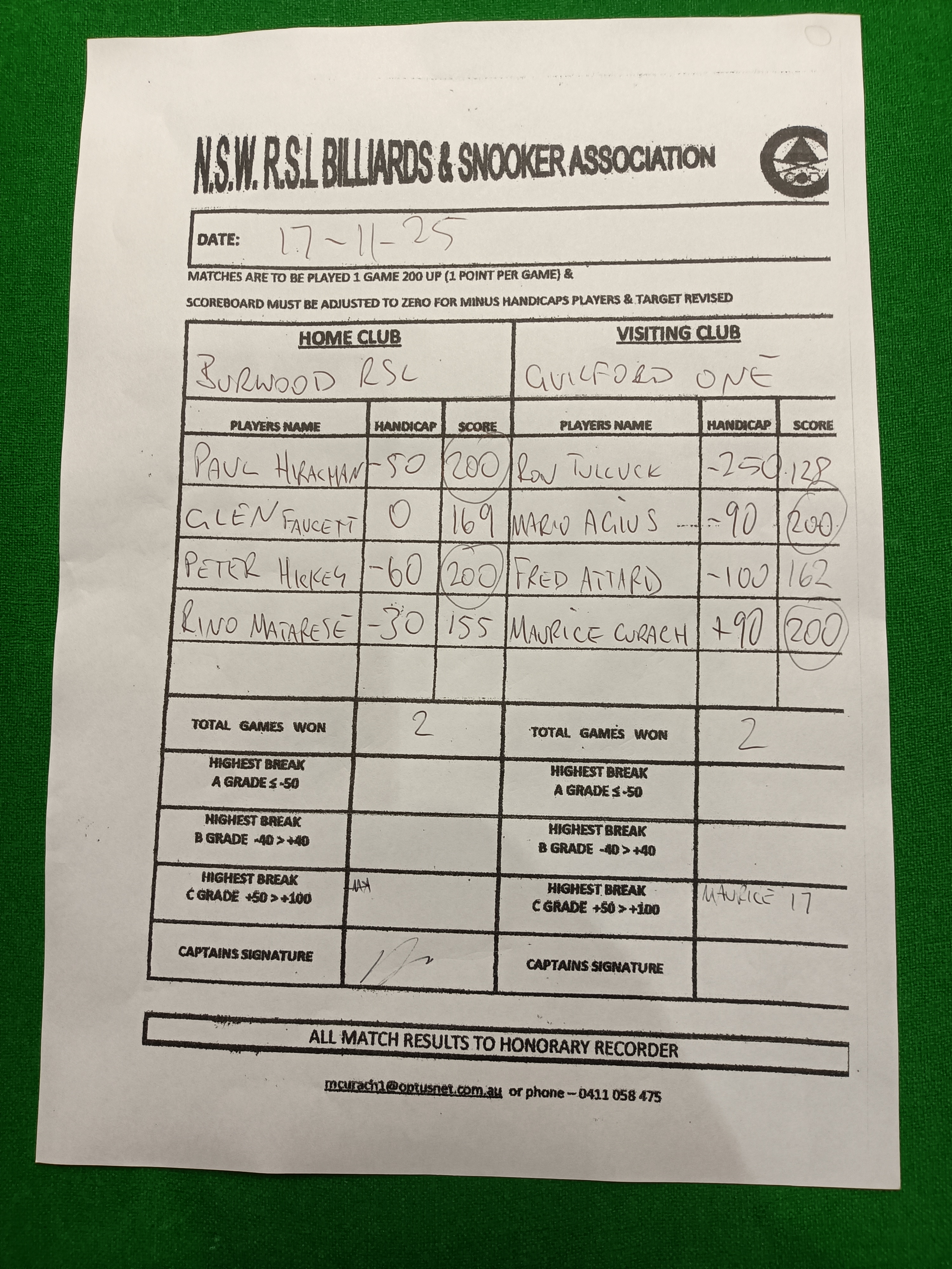 | POS | Burwood | Score | PTS | Break | Guildford #1 | Score | PTS | Breaks | Result Note | Updated on | Update by |