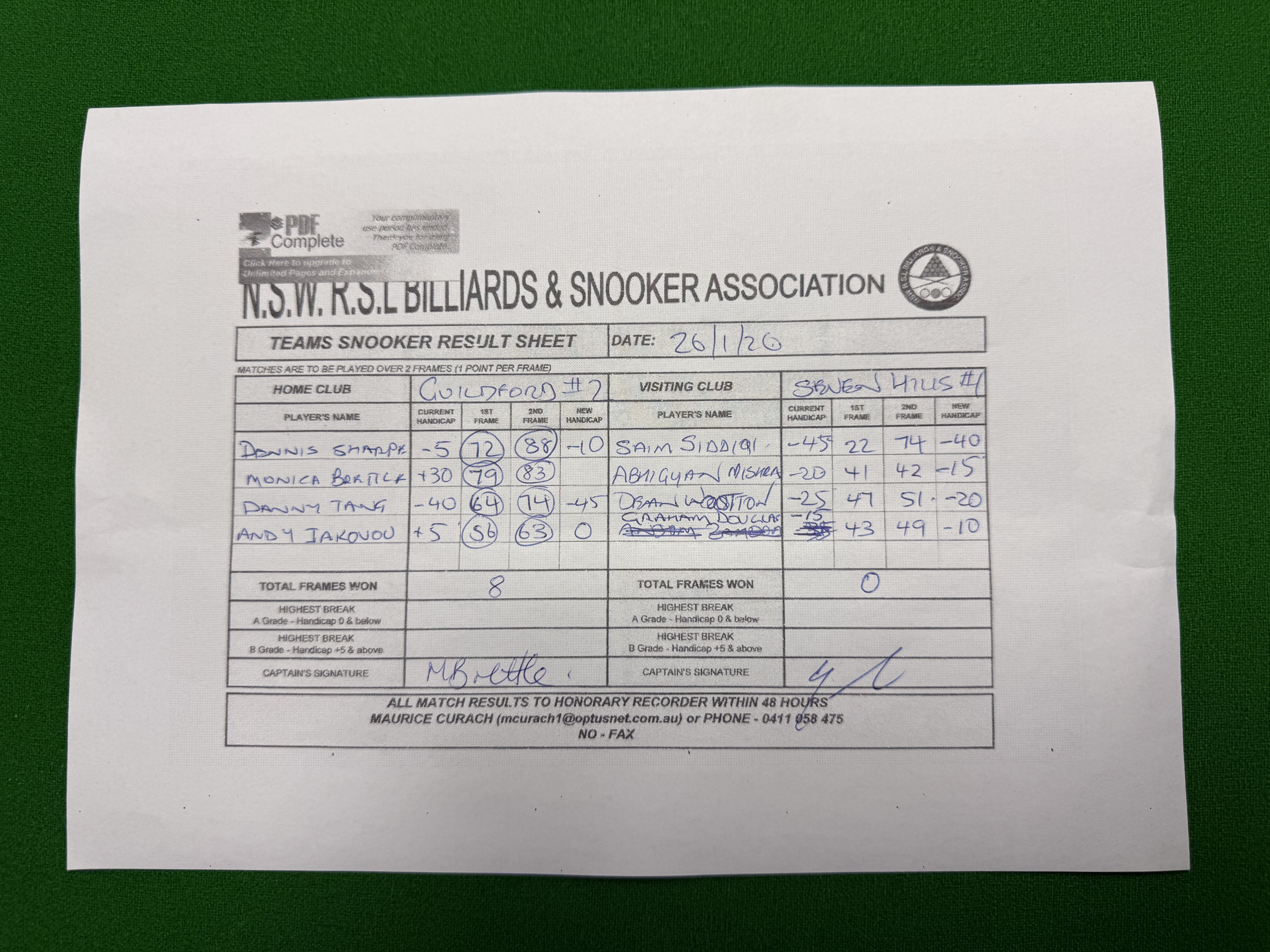 | POS | Guildford #2 | Frame 1 | Net | Frame 2 | Net | PTS | Breaks | Seven Hills #1 | Frame 1 | Net | Frame 2 | Net | PTS | Breaks | Result Note | Updated on | Update by |