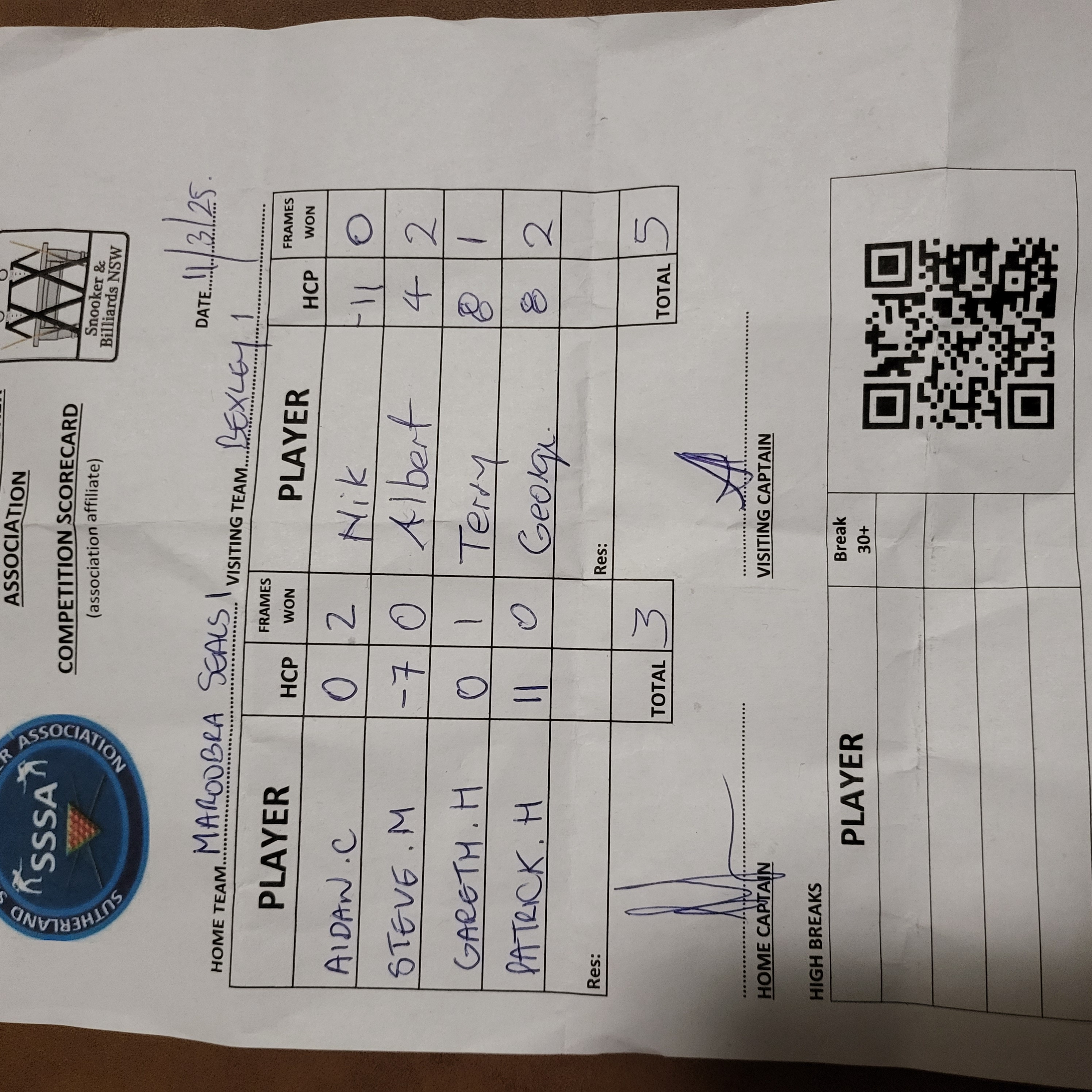 | POS | Maroubra Seals #1 | Frame Won | Break | Bexley RSL #1 | Frame Won | Break | Result Note | Updated on | Update by |