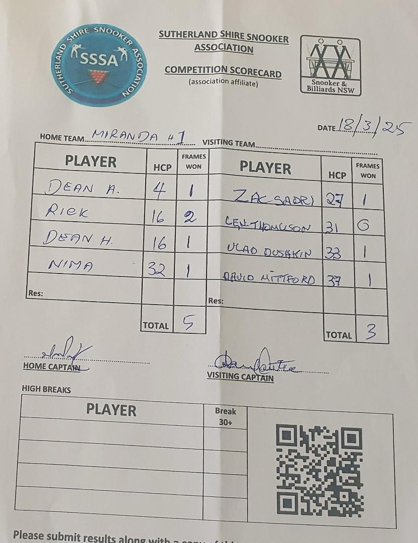| POS | Miranda RSL #1 | Frame Won | Break | Maroubra Seals #2 | Frame Won | Break | Result Note | Updated on | Update by |