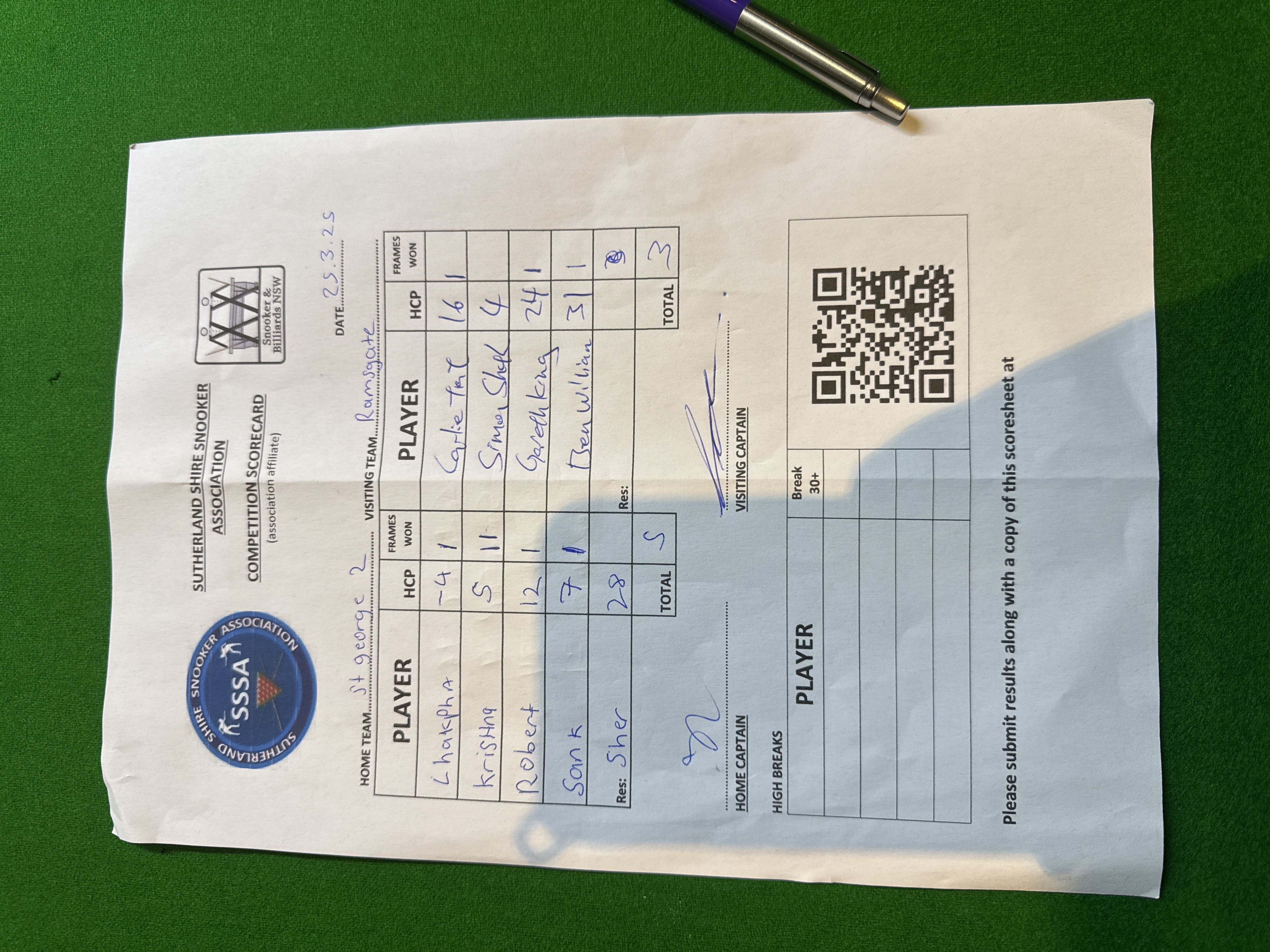 | POS | St George #2 | Frame Won | Break | Ramsgate RSL #1 | Frame Won | Break | Result Note | Updated on | Update by |