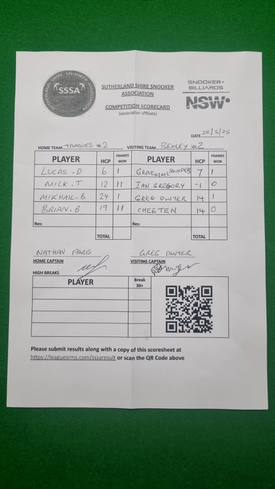 | POS | Tradies #2 | Frame Won | Break | Bexley RSL #2 | Frame Won | Break | Result Note | Updated on | Update by |