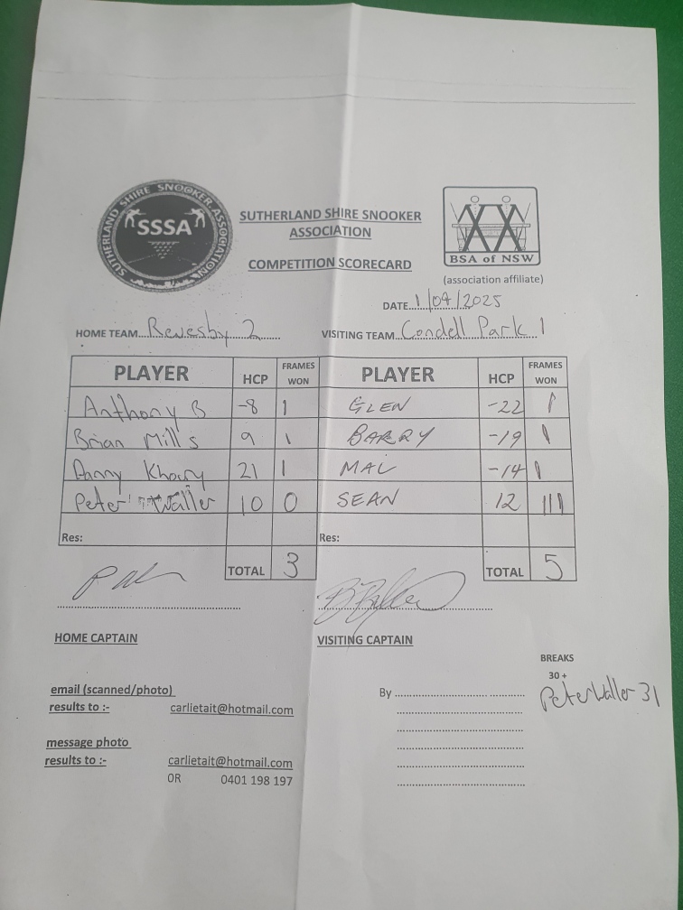 | POS | Revesby Workers #2 | Frame Won | Break | Condell Park #1 | Frame Won | Break | Result Note | Updated on | Update by |