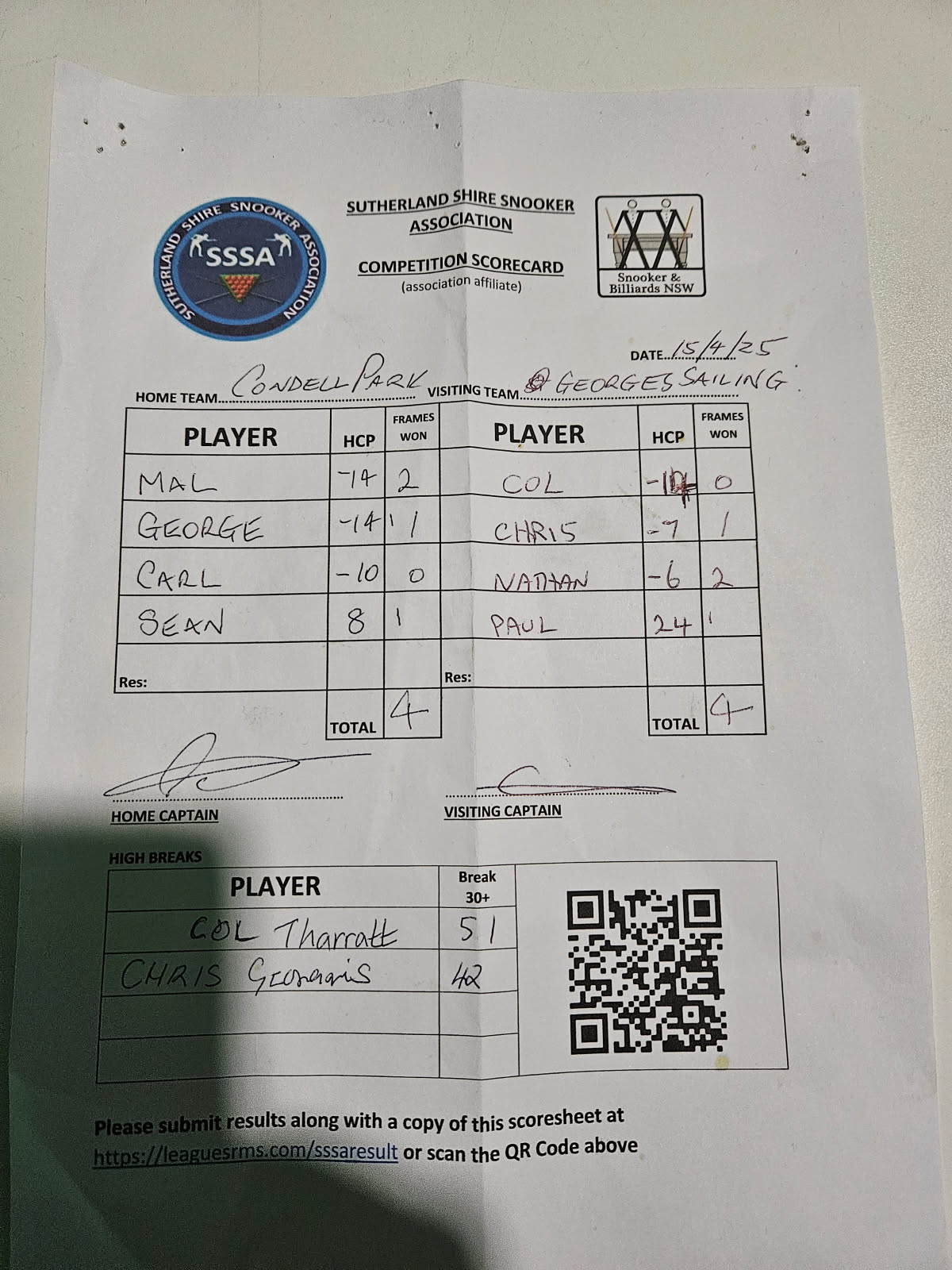 | POS | Condell Park #1 | Frame Won | Break | Georges River #1 | Frame Won | Break | Result Note | Updated on | Update by |