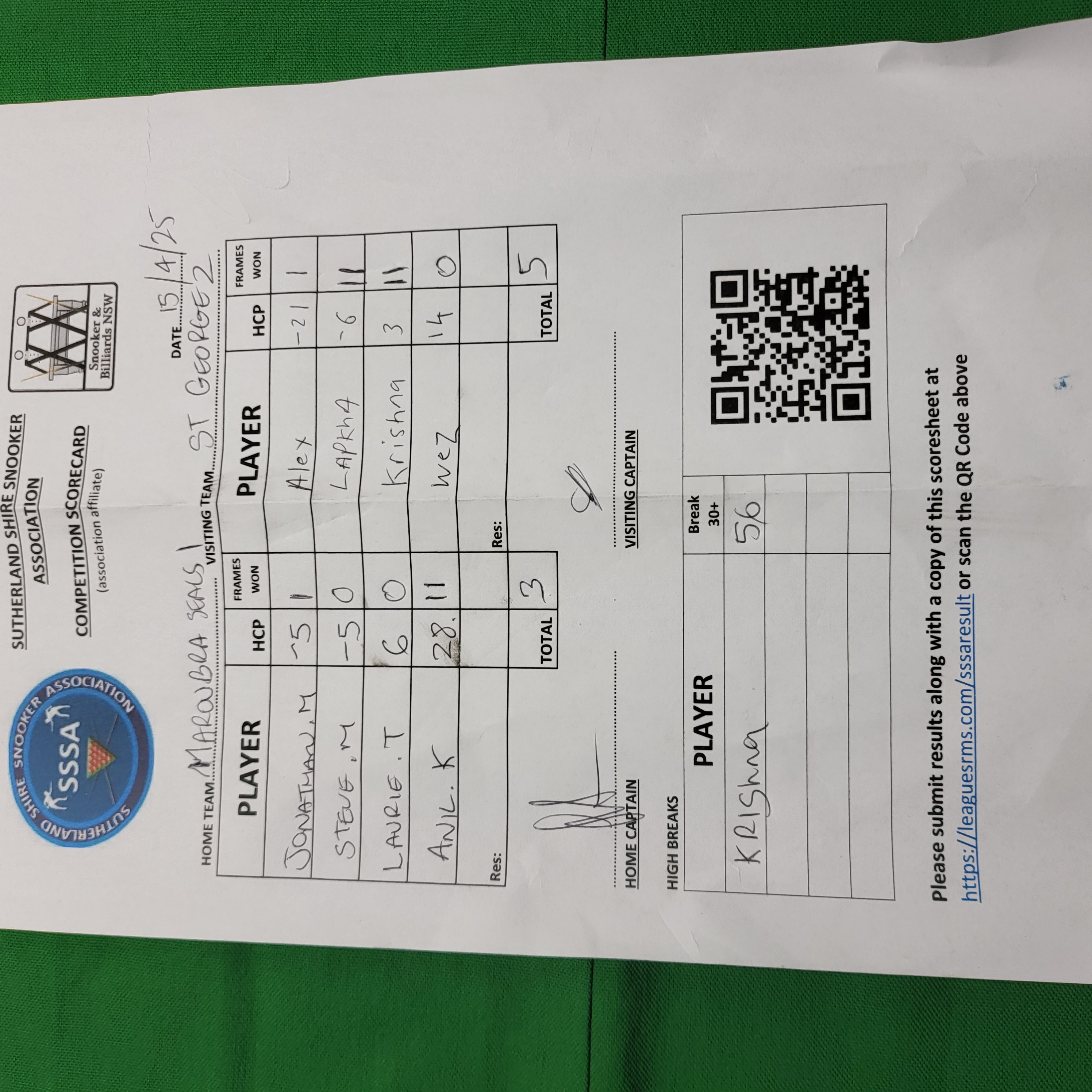 | POS | Maroubra Seals #1 | Frame Won | Break | St George #2 | Frame Won | Break | Result Note | Updated on | Update by |