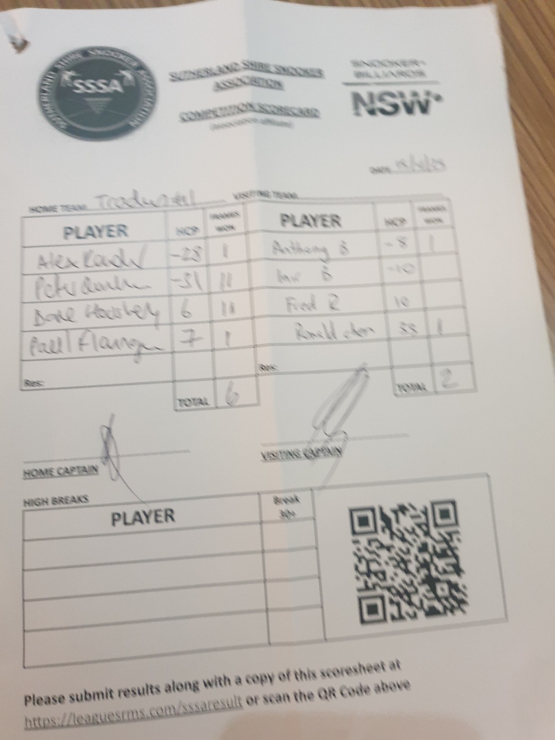 | POS | Tradies #1 | Frame Won | Break | Revesby Workers #2 | Frame Won | Break | Result Note | Updated on | Update by |