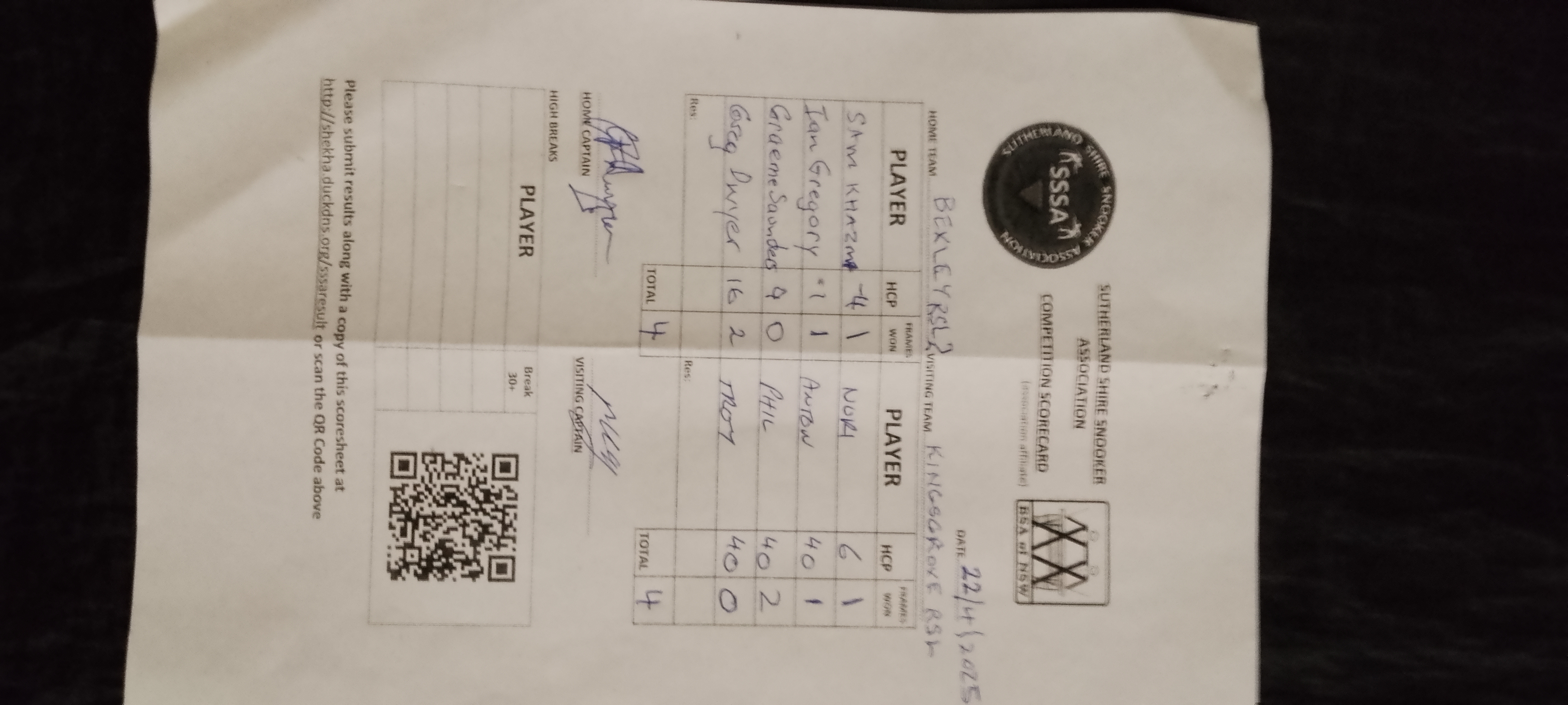 | Greg Dwyer (16) | Troy Pepping (40) | 2025-04-22 23:00:32 | Bexley RSL #2 |