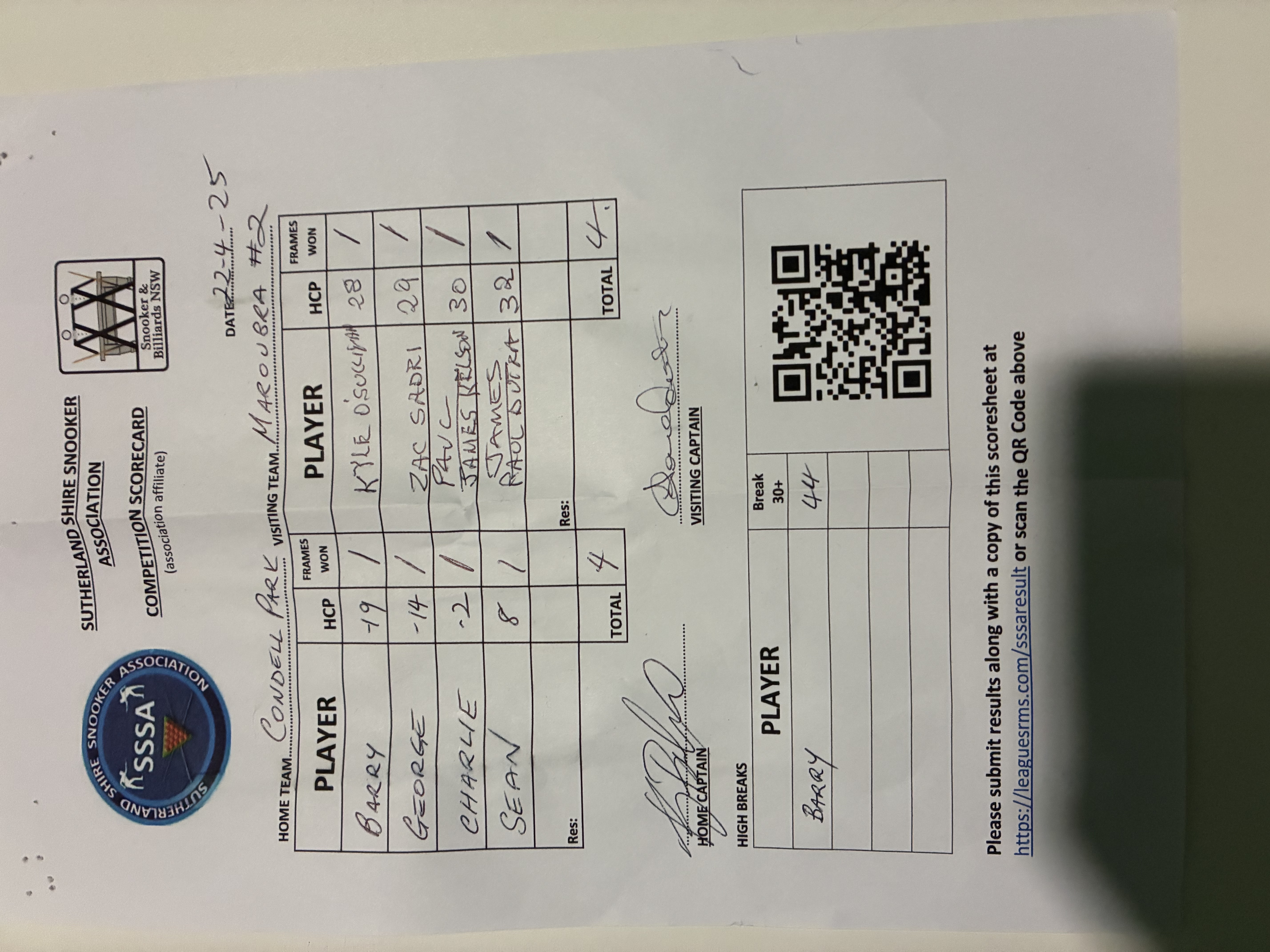 | POS | Condell Park #1 | Frame Won | Break | Maroubra Seals #2 | Frame Won | Break | Result Note | Updated on | Update by |
