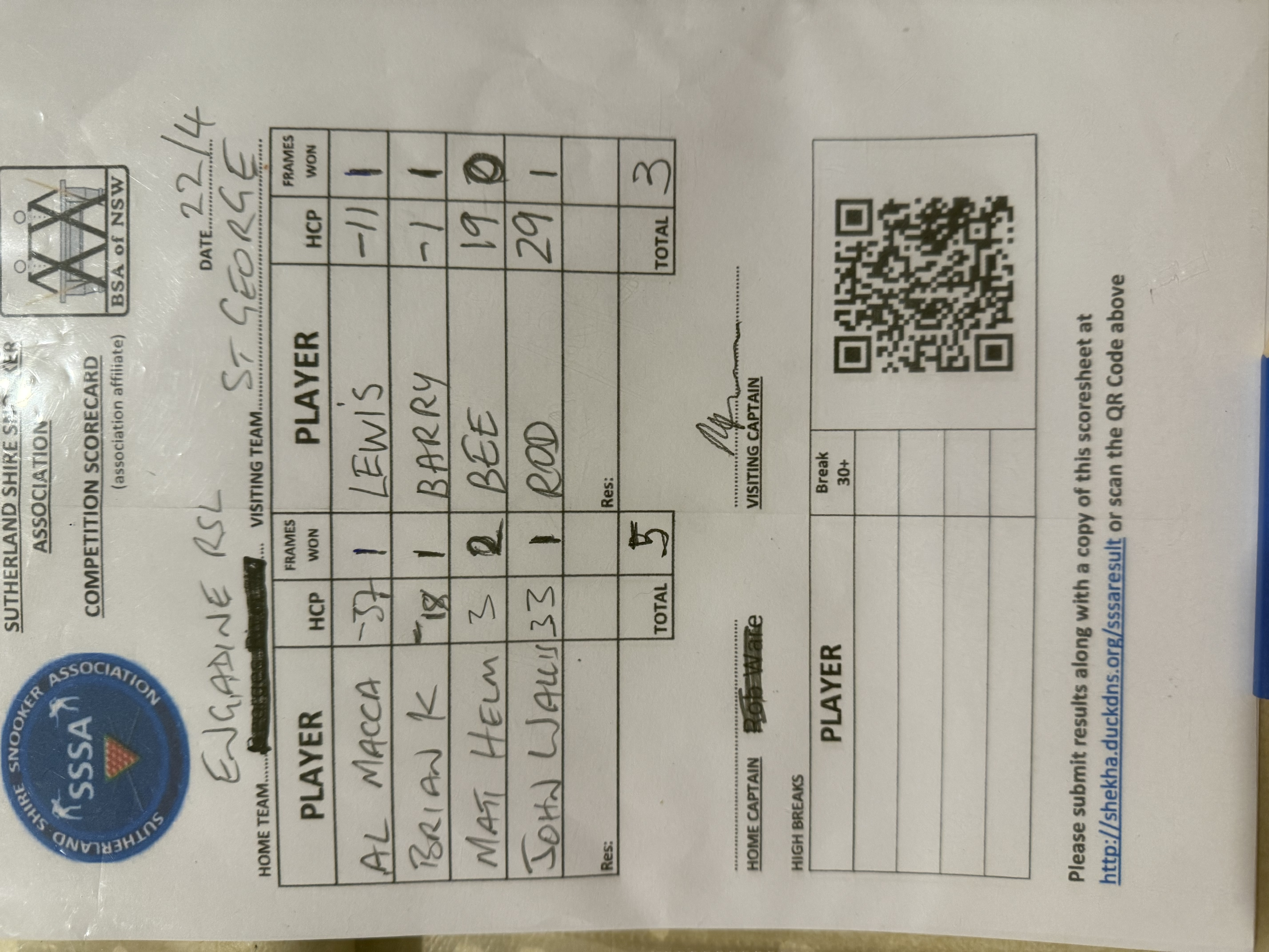 | POS | Engadine #1 | Frame Won | Break | St George #1 | Frame Won | Break | Result Note | Updated on | Update by |