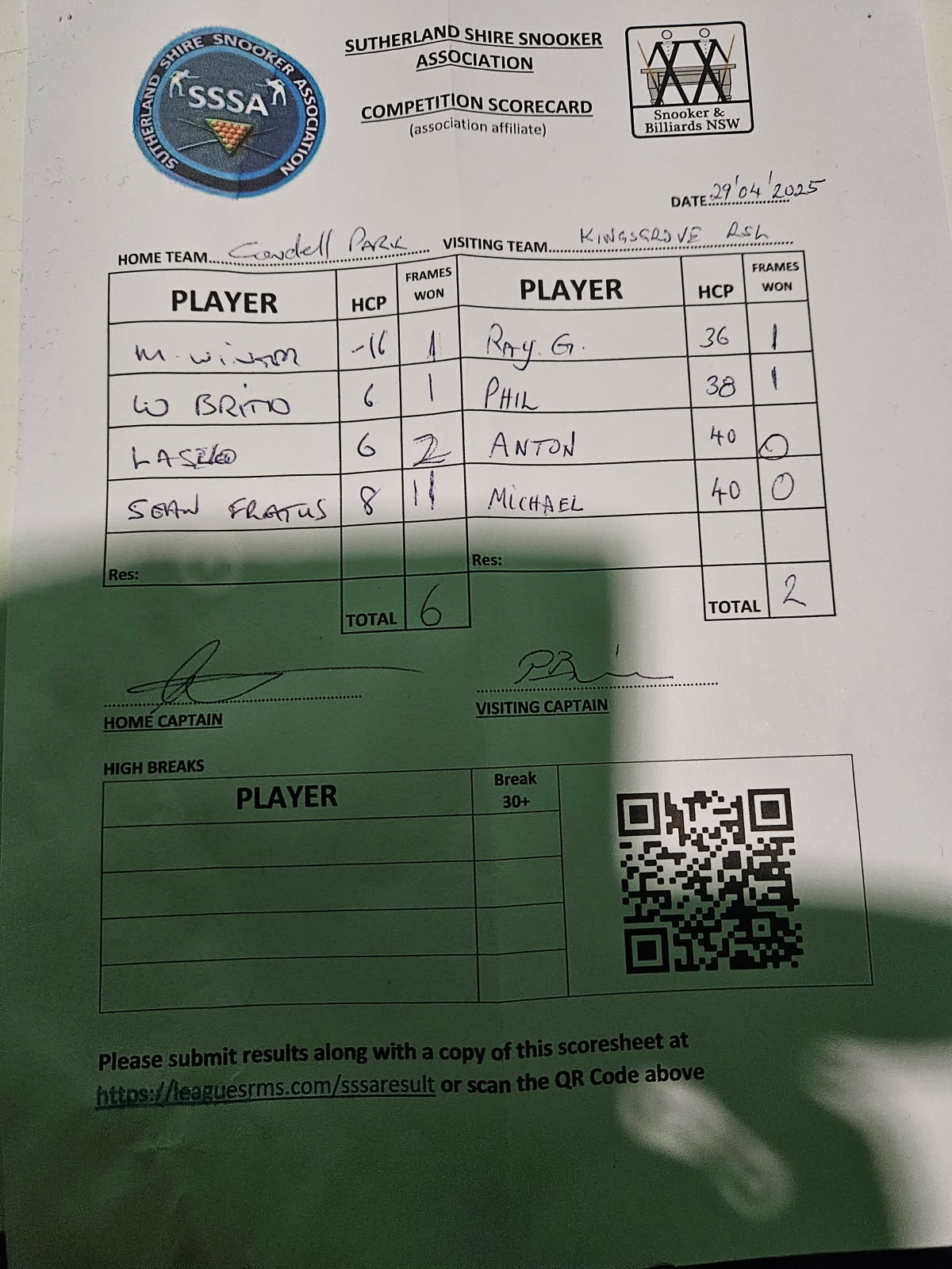 | POS | Condell Park #1 | Frame Won | Break | Kingsgrove #1 | Frame Won | Break | Result Note | Updated on | Update by |