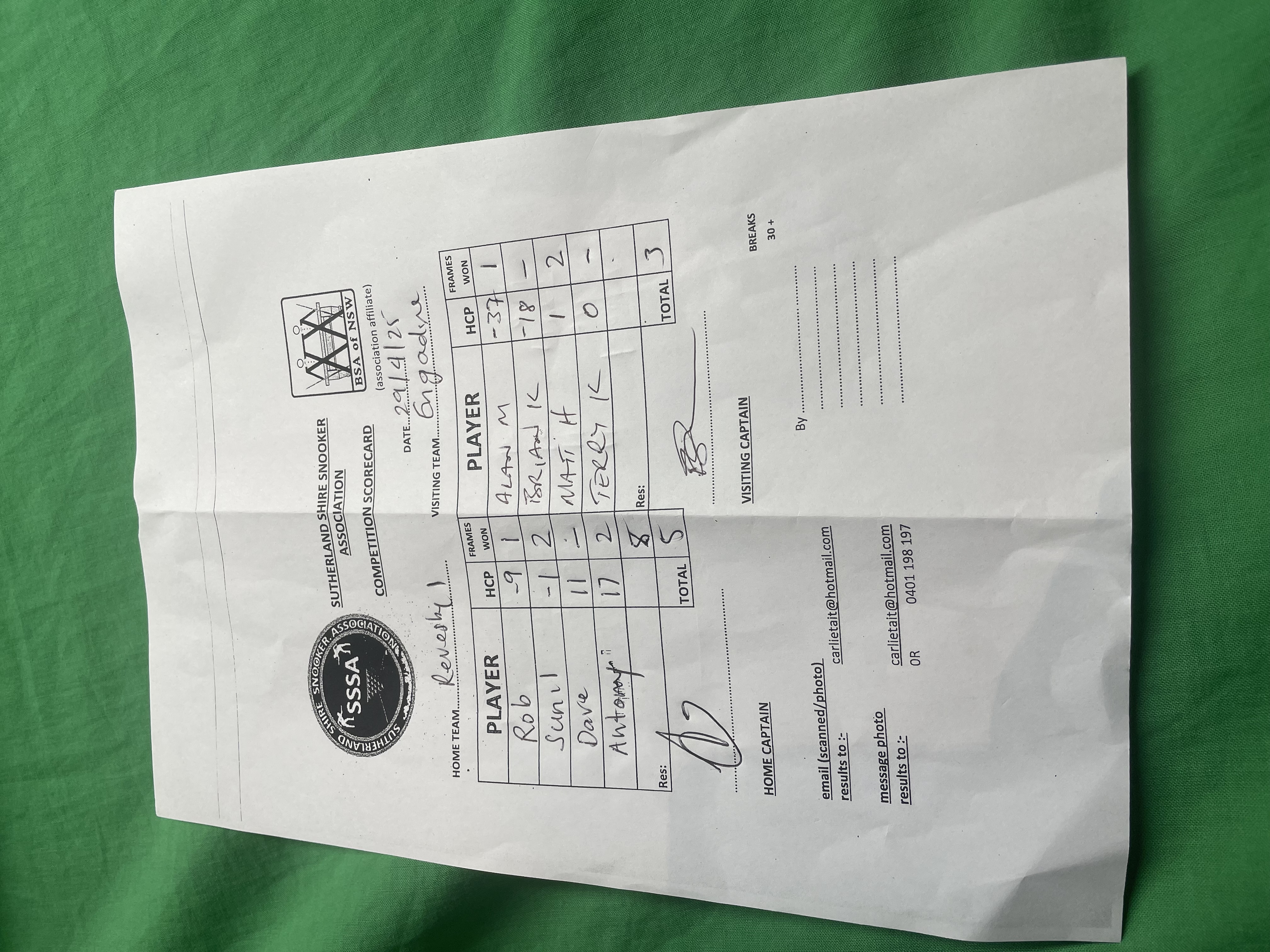 | POS | Revesby Workers #1 | Frame Won | Break | Engadine #1 | Frame Won | Break | Result Note | Updated on | Update by |