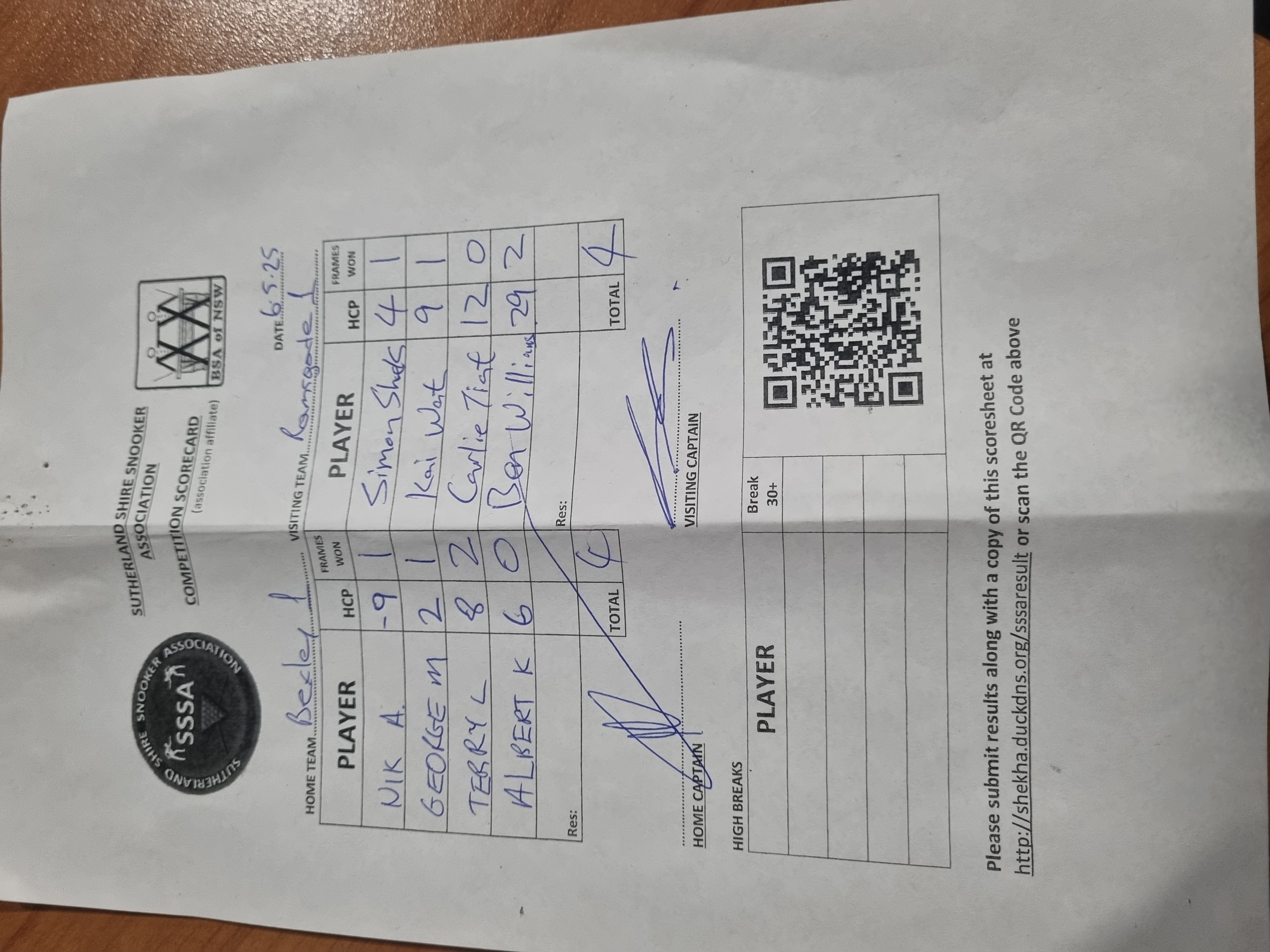 | POS | Bexley RSL #1 | Frame Won | Break | Ramsgate RSL #1 | Frame Won | Break | Result Note | Updated on | Update by |