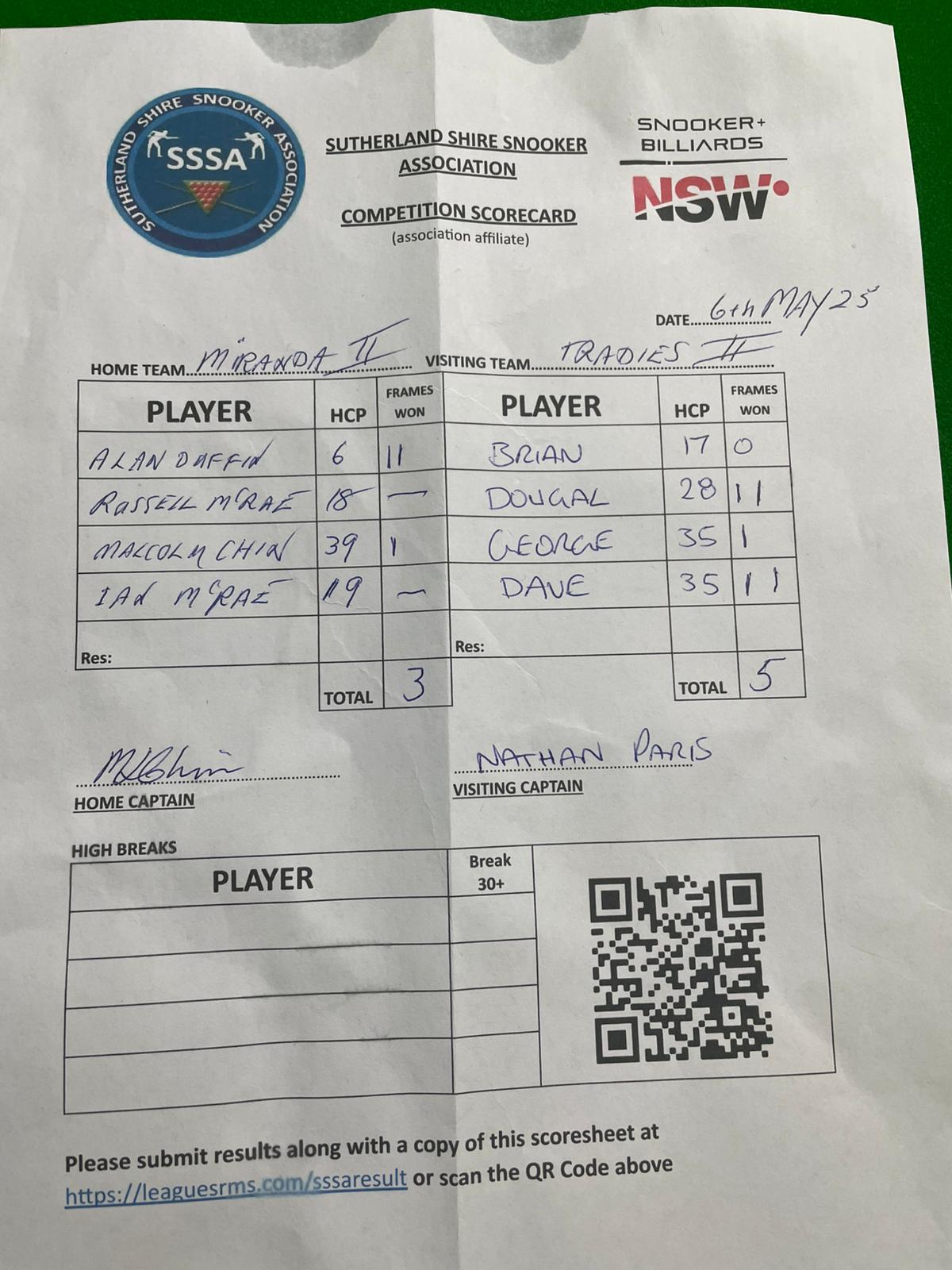 | Ian McRae (19) | Dave Fogarty (35) | 2025-05-06 23:03:13 | Tradies #2 |