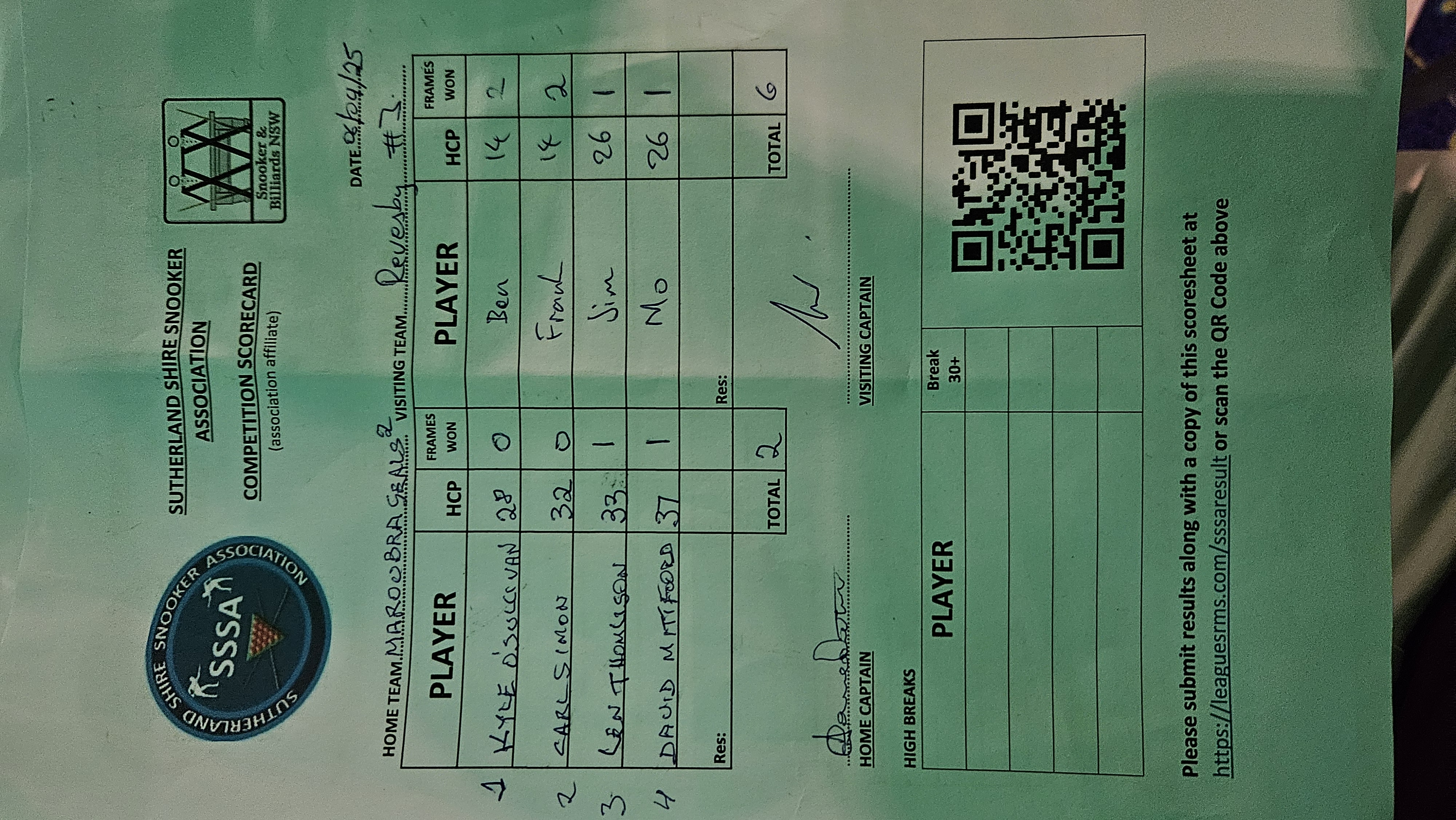 | POS | Maroubra Seals #2 | Frame Won | Break | Revesby Workers #3 | Frame Won | Break | Result Note | Updated on | Update by |