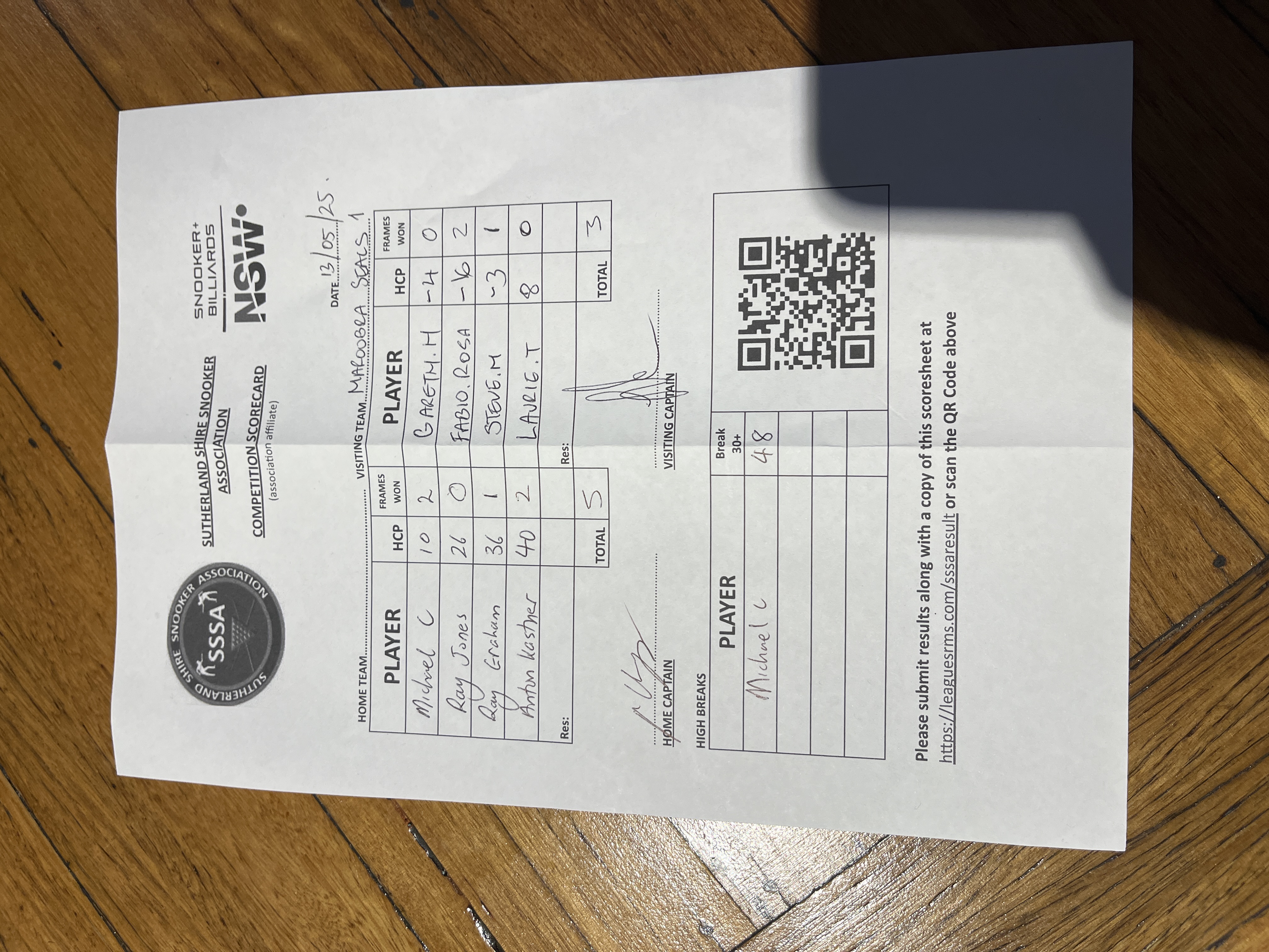 | POS | Kingsgrove #1 | Frame Won | Break | Maroubra Seals #1 | Frame Won | Break | Result Note | Updated on | Update by |