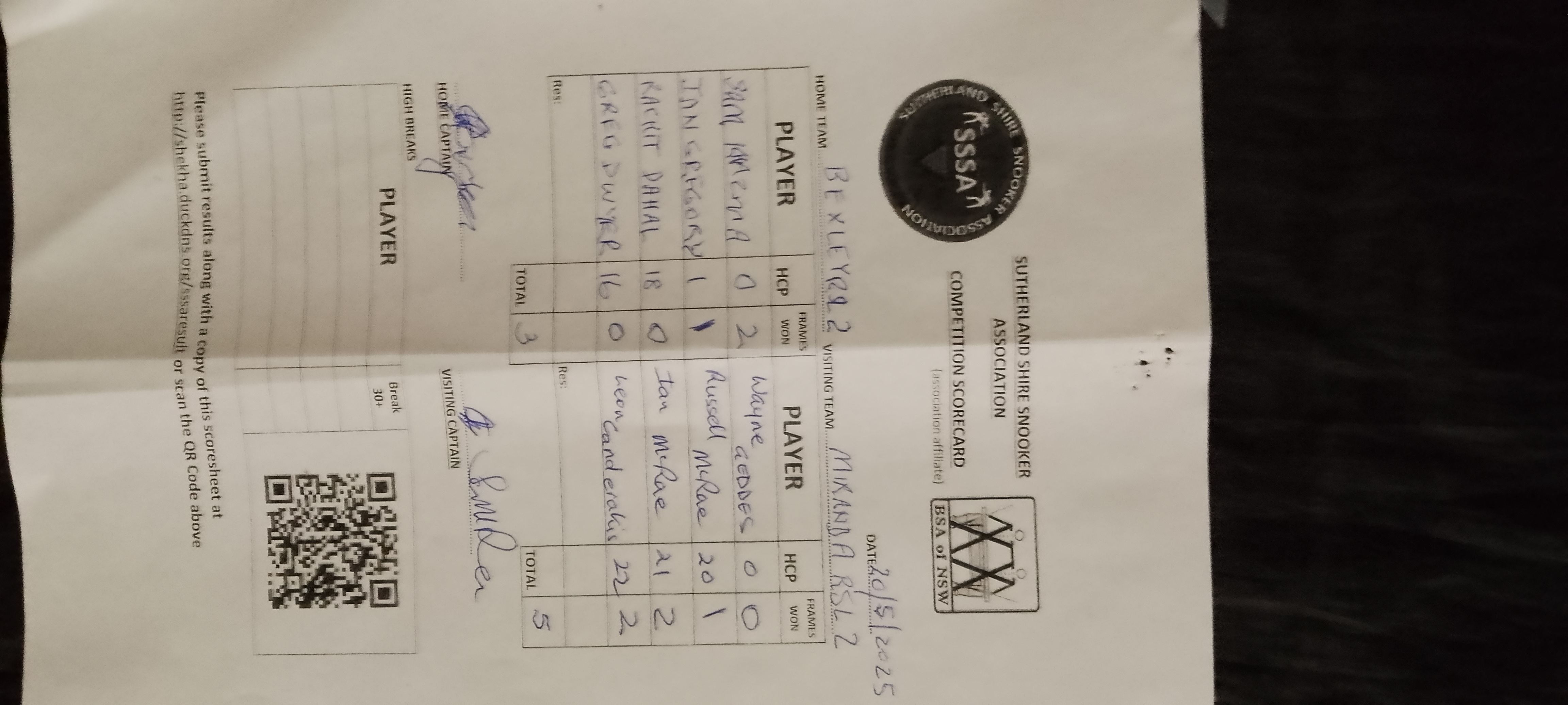 | Ian Gregory (1) | Russel McRae (20) | 2025-05-20 21:54:09 | Bexley RSL #2 | ||||||