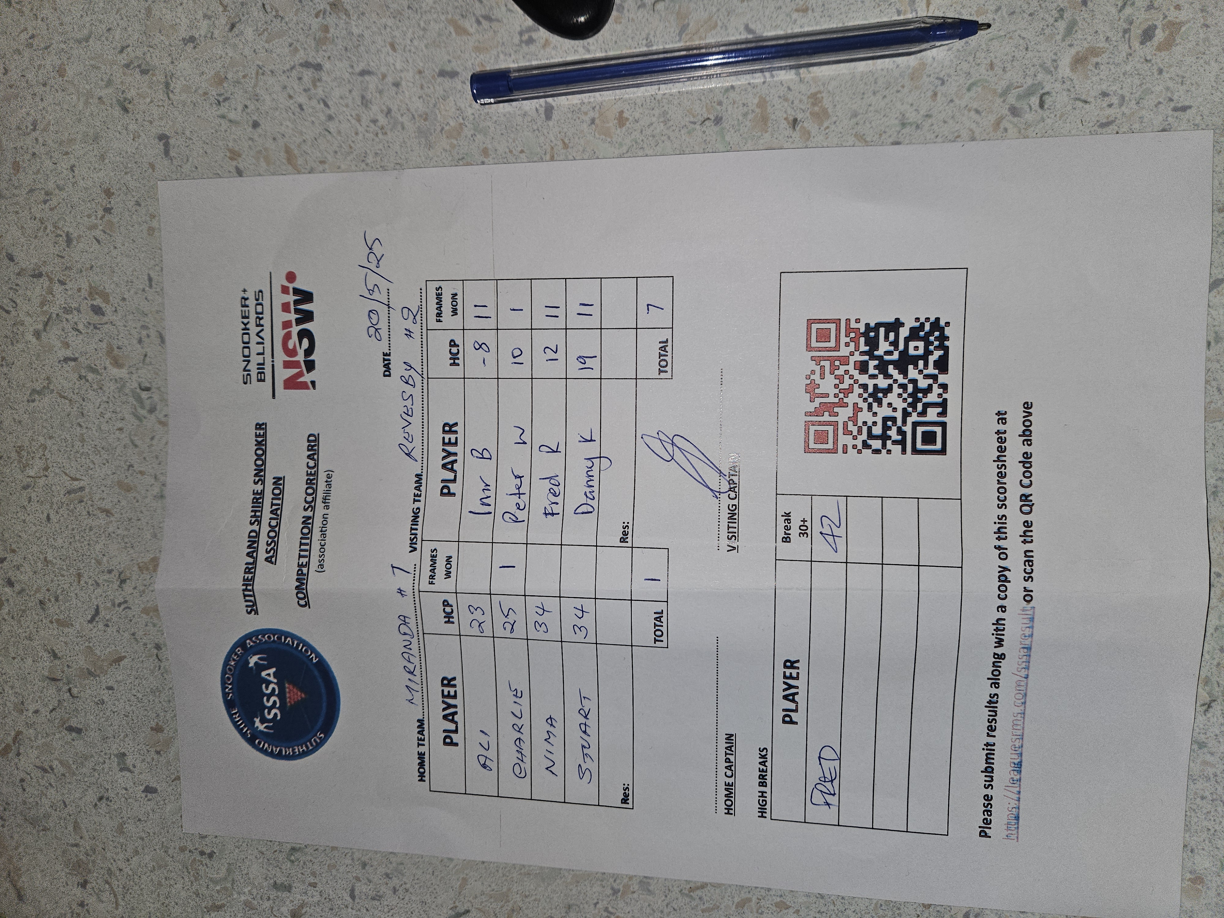 | POS | Miranda RSL #1 | Frame Won | Break | Revesby Workers #2 | Frame Won | Break | Result Note | Updated on | Update by |