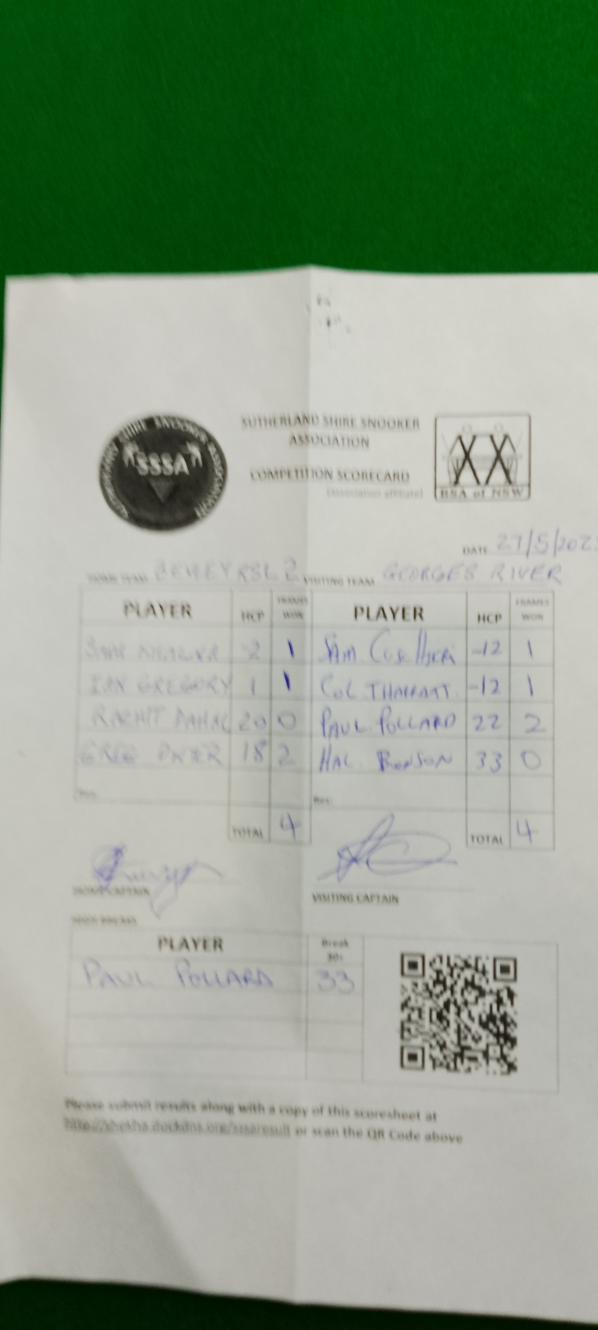 | POS | Bexley RSL #2 | Frame Won | Break | Georges River #1 | Frame Won | Break | Result Note | Updated on | Update by |
